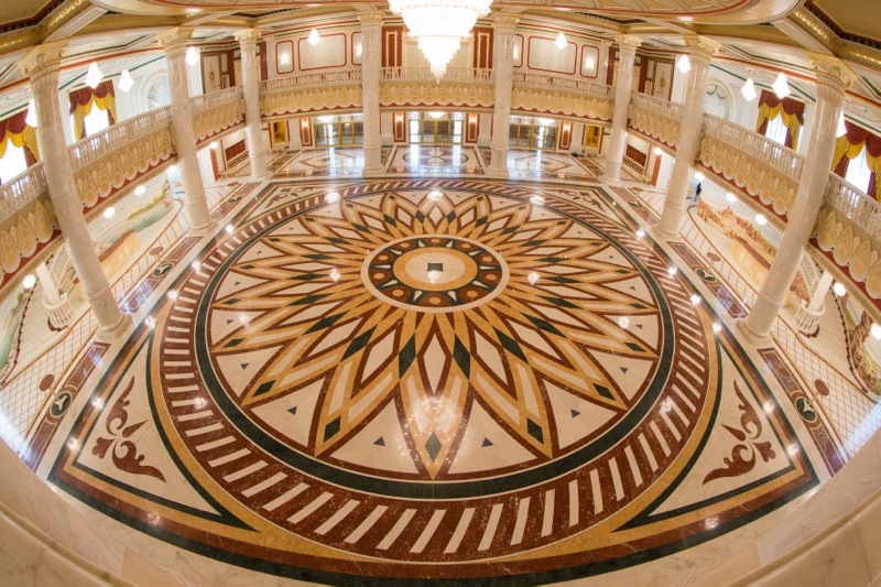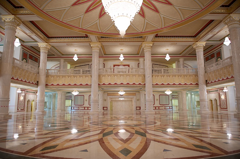 В отличие от футуристического стиля большинства строений новой столицы театр выдержан в классических традициях: портик с колоннами и квадригой над ним, итальянская подкова зрительного зала с золочёными ярусами и ложами, просторные мраморные фойе. По форме – старый европейский театр, но исполнение проекта поражает азиатской роскошью и гигантизмом: всё здесь огромно, масштабно, богато. Сцена с карманами напоминает размерами палубу авианосца, а в просторных фойе вполне можно устраивать военные построения. И вместе с тем, при всей гигантомании и некотором излишестве декора есть в этом здании своя гармония, красота, даже утончённость. Словом, настоящая Опера!