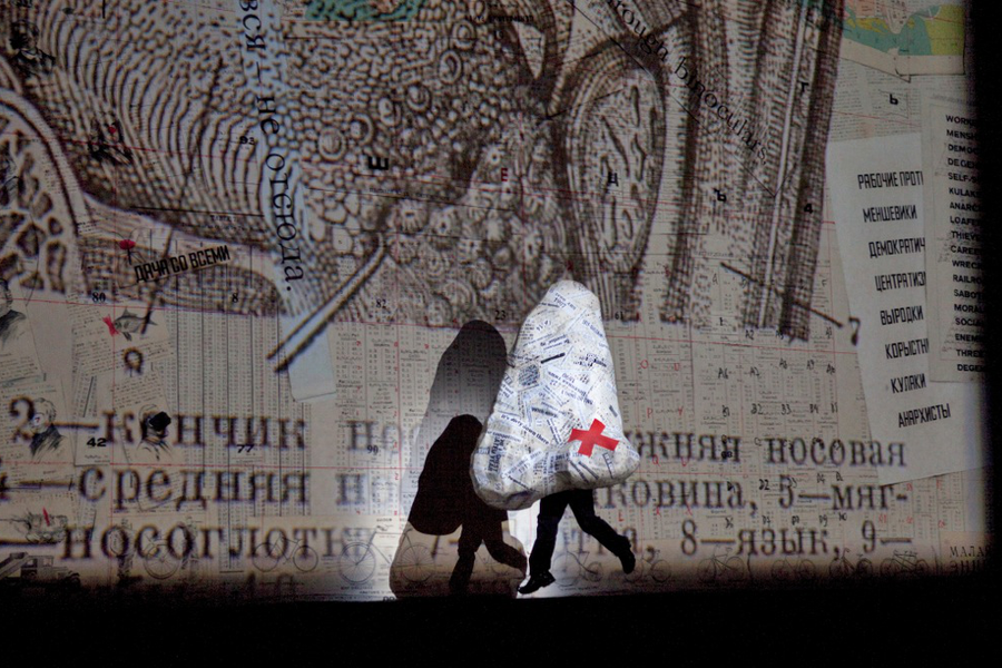 Если во времена Шостаковича говорили о кинематографическом характере действия, то сейчас это называется клиповым монтажом. Так авангард тридцатых годов XX века оказывается актуальным в веке двадцать первом! Но режиссер Уильям Кентридж идет еще дальше. Художник по образованию, он пускает в ход свой излюбленный прием – анимацию. И вот из маленького предмета на полсцены вырастает Нос. Он гуляет по Невскому проспекту, прогуливается по Таврическому саду, бежит с красным флагом. Его очертания воспаряют над сценой. А вот из Носа вырастает изображение Сталина, и как-то сразу не по себе становится. Он курит трубку, дым заполняет все пространство сцены и вспоминаешь уже не Мейерхольда с футуристами, а “кремлевского горца” Осипа Мандельштама: “Его толстые пальцы, как черви, жирны, А слова, как пудовые гири, верны, Тараканьи смеются усища, И сияют его голенища”. Да это же про нас про всех – какая там Россия 30-х годов XIX века, какой там Гоголь?! Нос-выскочка, нос-ничтожество, нос-крошка Цахес (опять привет Гофману!)…
