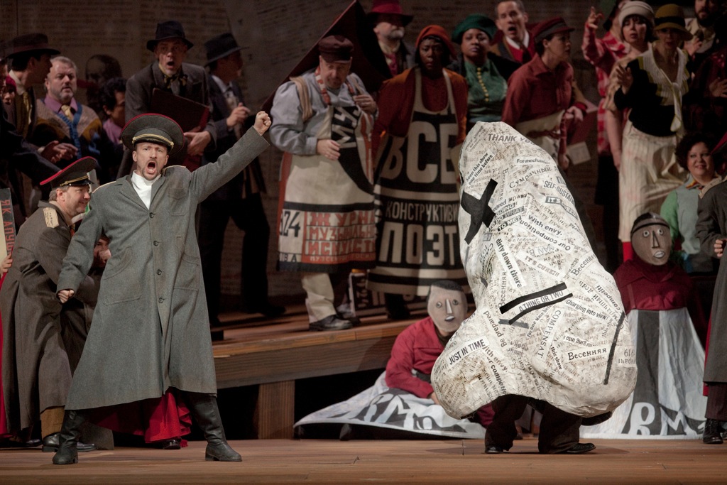 Часто в последнее время мы жалуемся на произвол оперных режиссеров, сетуем, что в попытке самовыражения они забывают о музыке, солистах и тянут одеяло на себя. В этом спектакле все не так. Уильям Кентридж показывает блестящее знание материала. Он виртуозно играет и манипулирует с так называемым советским стилем. Подобный коллаж из советских плакатов и лозунгов легко представить себе в спектаклях того же Мейерхольда середины двадцатых годов, но увидеть такое в Метрополитен-опере образца 2013 года я все-таки не ожидал. В словах Станиславского “Мейерхольд из Гоголя сделал Гофмана” слышится противопоставление двух имен. А для меня эти имена стоят рядом. Мейерхольд и Таиров в театре, футуристы в поэзии, Кандинский и Малевич в живописи, Хармс и Замятин в литературе (Замятин, кстати, наряду с Александром Прейсом и Георгием Иониным - один из соавторов либретто), Шостакович в музыке – таков общий фон нового искусства новой, Советской России, в контекст которого вполне вписывается спектакль Кентриджа.