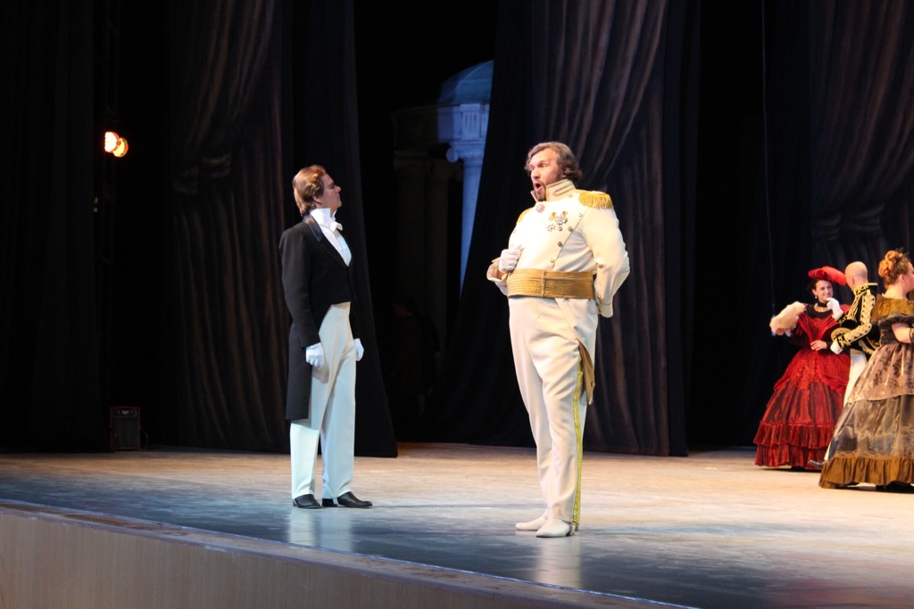Помимо Петропавловки на заднике приветы из Петербурга многочисленны: фактически, вся премьерная постановочная команда – питерская. Певцы тоже главным образом – из северной столицы России. И надо сказать, что певческий уровень первой приморской премьеры был весьма достойным. Алексей Марков совершенно блистательно исполнил титульную партию, продемонстрировав ровный, красивый, с настоящим столичным лоском голос, а также уверенную игру – его пребывание в образе петербургского сноба, прозревающего лишь к финалу, было весьма достоверным. Прекрасно провела партию Татьяны и Наталья Тимченко: её красивое сопрано, крепкое, но гибкое, необыкновенно подошло к данному музыкальному материалу, ему хватало и лирической нежности, и накала драматизма. Внешний вид обоих протагонистов соответствовал классическим представлениям о харизматичных героях русской оперной литературы, что встречается не так уж и часто.