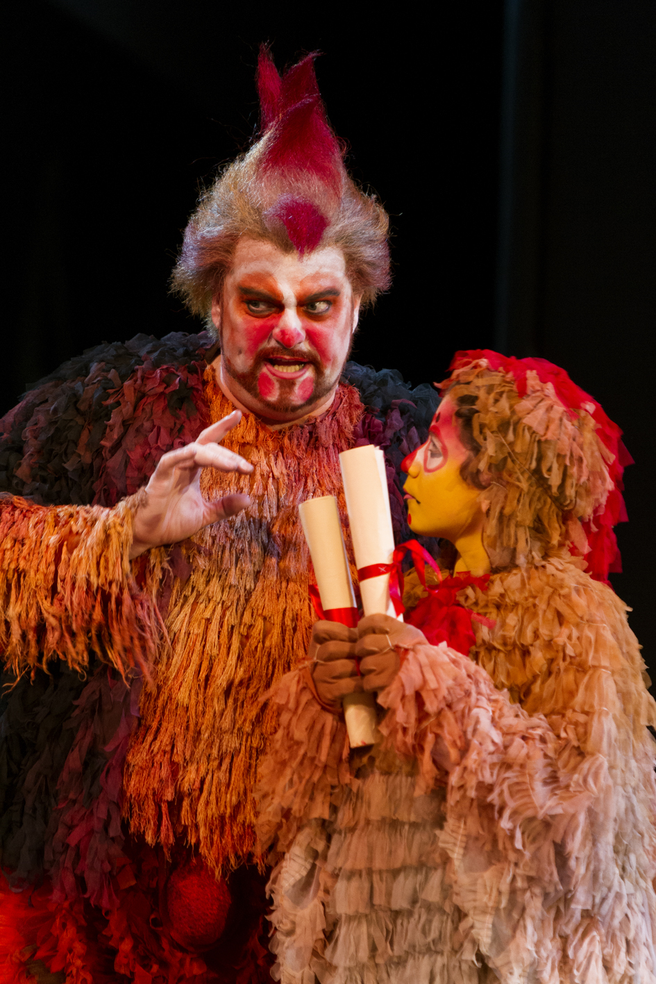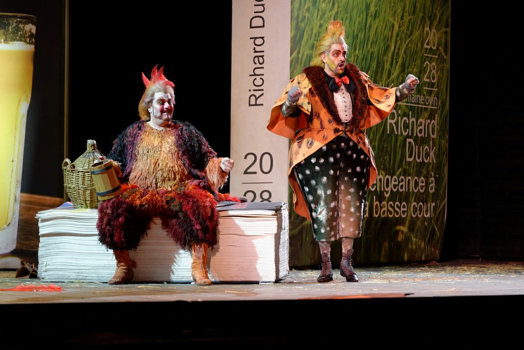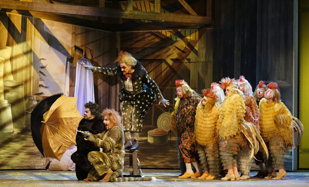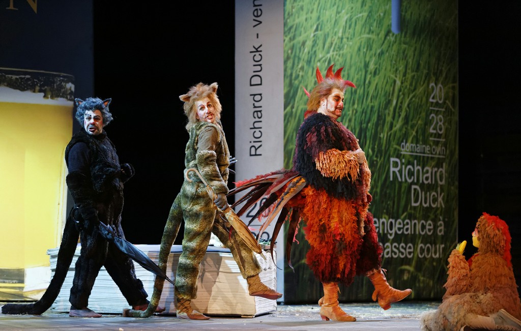Итак о спектакле. В отличие от классичной постановки Парижской оперы, о которой я писала совсем недавно, режиссёр-постановщик Жан-Луи Гринда выбрал самый комичный стиль. Действие перенесено в курятник, и каждый персонаж представляет птицу или домашнее животное: сам Фальстаф - огромный и расфуфыренный петух, Алиса и её муж Форд - куры, Бардольфо и Пистола - коты, все женские персонажи - курочки, слуги - мышки и т.д.