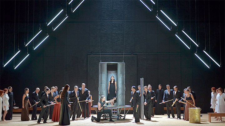 Впрочем, слышны и критические ноты. В частности, один из критиков пишет, что выбор руководством театра Лакаскада вряд ли представляется удачным, ибо он «как большинство театральных режиссеров слишком обозначает свое присутствие», в результате чего опера перегружена суетливыми движениями, что не вполне подходит ее «храмовой» стилистике. Возможно, эта перегруженность сильнее ощущается на фоне довольно лаконичного внешнего облика спектакля, решенного в конструктивистско-минималистическом условном ключе (сценография - Эмманюэль Клолус).