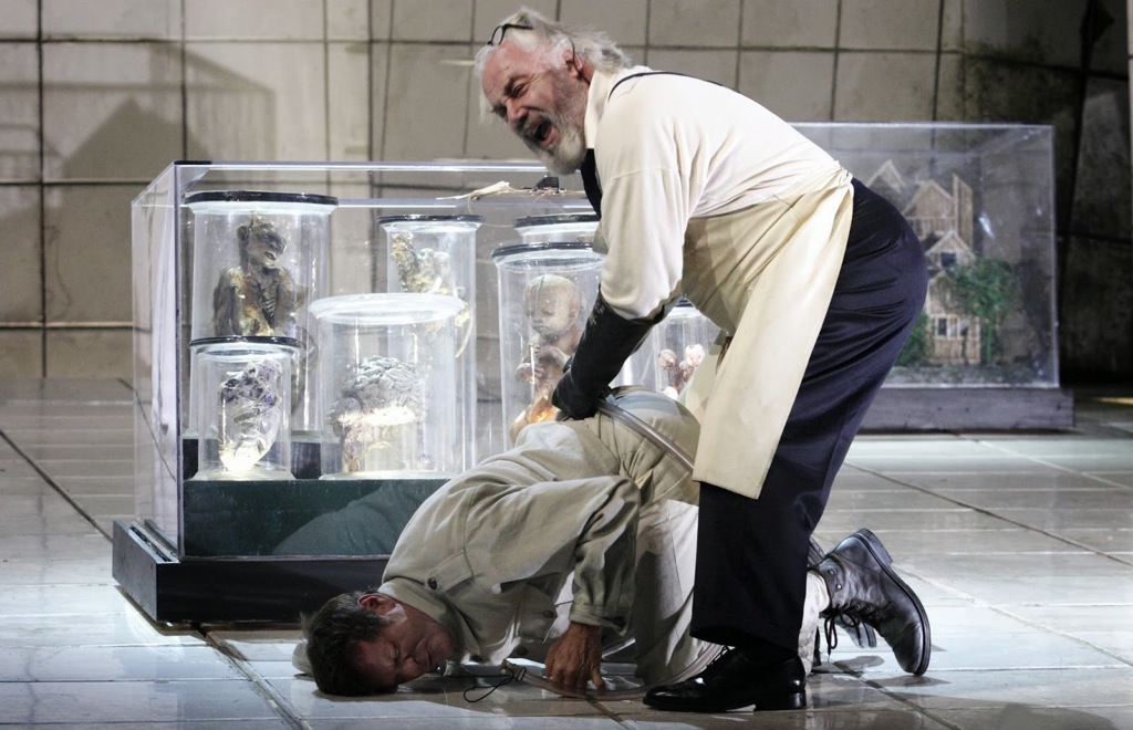 Действие разворачивается в клинической белизне медицинской лаборатории. Это мир, где человек – бесправный, невинный, уязвимый, униженный и оскорбленный (Воццек) – значит для доктора и капитана не больше, чем лабораторная крыса. Он тонет, как и полагается по сюжету, но оказывается в конце, как заспиртованный уродец в пробирке на полках музея кунсткамеры, утонувшим в окровавленной воде одной из четырёх больших стеклянных витрин – человеческий предмет для экспериментов.