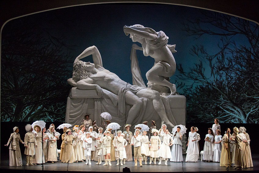 Выбранный мною жанр статьи дает мне право остановиться в этом месте, добавив справочно несколько слов о любопытной и местами красивой сценографии Виктора Герасименко, имеющей, впрочем, столь же мало отношения опере Чайковского, за исключением, пожалуй, скульптурного лейтмотива – увеличенной и модифицируемой по ходу действия копии скульптуры «Амур и Психея» из Летнего сада…