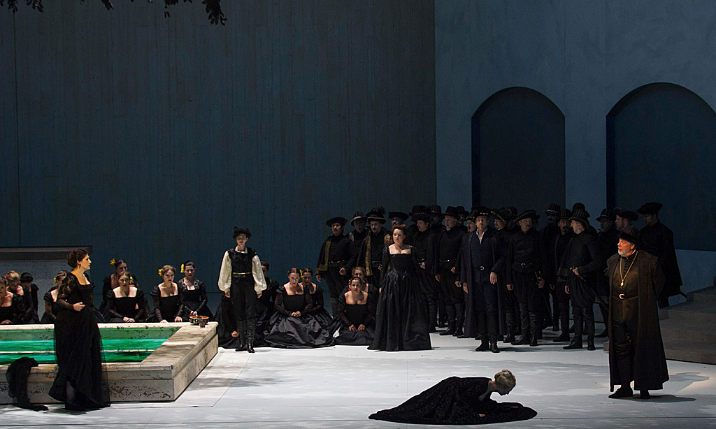 Все события мюнхенского «Дон Карлоса» показаны как на ладони. Большой черный квадрат сцены имитирует пространство монастыря Сан-Джусто с диагональной диспозицией массивного Распятия и остается до конца спектакля целостным и единственным константным компонентом сценографии Юргена Розе. Особая атмосфера воцерковлености пронизывает внутреннюю сущность событий от сцен в монастыре до народного бунта. Логика минималистичного решения «Дон Карлоса» в виде «черного квадрата» (как репрезентанта «черной легенды» времен испанской монархии) противоположна логике масштабной, реалистически трактованной сцены зальцбургской постановки, визуально насыщенной романтическими атрибутами (фонтан, сады, ориентальные фонарики). Художник-постановщик Фердинанд Вёгербауэр оформил действие разнообразием красочных декораций. Встреча Елизаветы и Карлоса предварена монументальной народной сценой (хор лесорубов). Одновременно это выразительный фон в экспозиции красоты, человечности и благородства французской принцессы Елизаветы: для блага своего народа она жертвует любовью к инфанту Карлосу и вступает в брак с его отцом (испанским королем Филиппом ІІ), который гарантирует заключение мирного договора между Францией и Испанией. Цель режиссера, сценически подчеркнуть большой формат жанра grand-opéra, воплощена почти кинематографически. Широкая, вытянутая в длину сцена зальцбургского Фестшпильхауса явилась для этого идеальным местом. Крупные передние планы в массовых сценах (Фонтенбло, аутодафе, бунт) эффектно оттенили камерно оформленные монологи и дуэты.