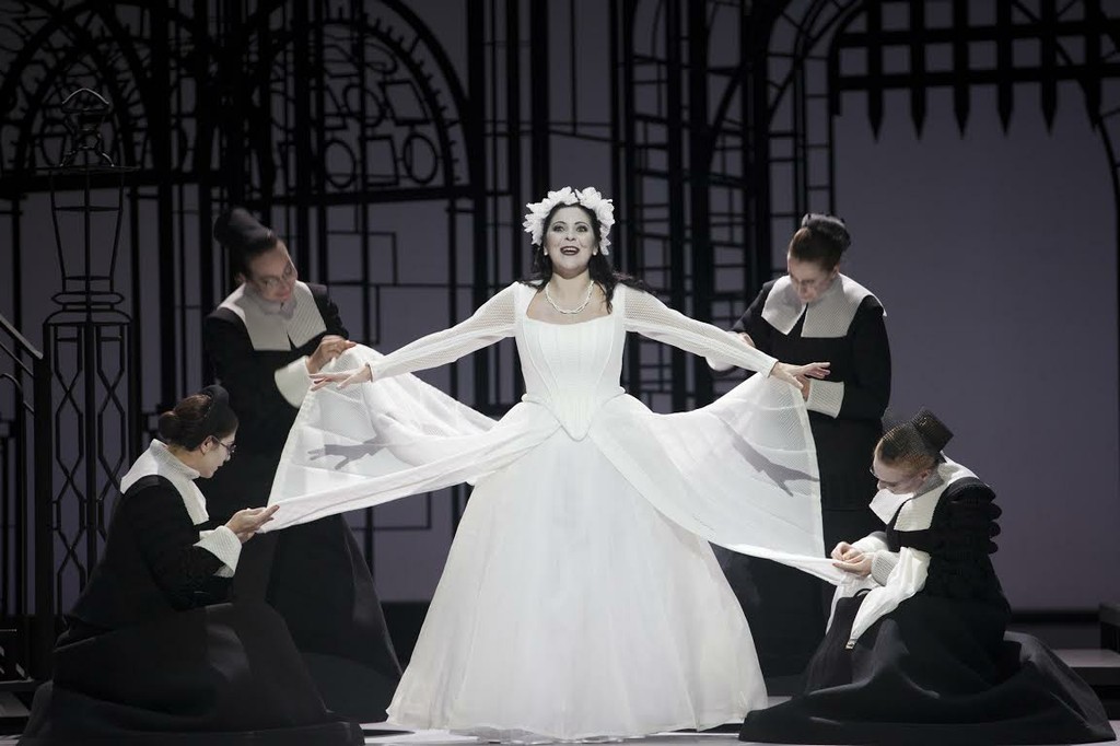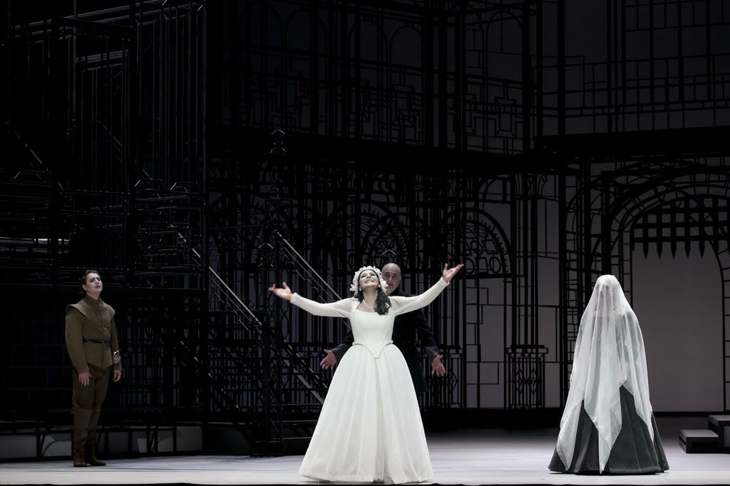 Эта опера не ставилась в Париже с 1987 года. Поэтому её ожидали со смесью нетерпения и сомнений: как это произведение будет звучать в гигантском пространстве Оперы Бастилии? К естественной трудности акустики добавилась особенность декорации Шанталь Тома, которую она выстроила в виде металлической кружевной конструкции, напоминающей по замыслу режиссёра одновременно и скелет средневекового замка и клетку, в которой бьётся несчастная Эльвира. Декорация практически весь спектакль вращается на круге посреди сцены, оставляя совершенно открытым задник, куда рассеивается звук. Из-за этого певцам пришлось петь в форсированной манере и получить от некоторых критиков упрёки в недостаточно рафинированной и тонкой нюансировке. Кстати, я уже писала о том, что у тех певцов, которых постоянно слышишь на сцене театра Бастилии, а потом встречаешь на сцене старинного театра Гарнье, очень застревает привычка форсировать звук. Но, в данной ситуации у них не было другого выхода, и результат получился очень хорошим.