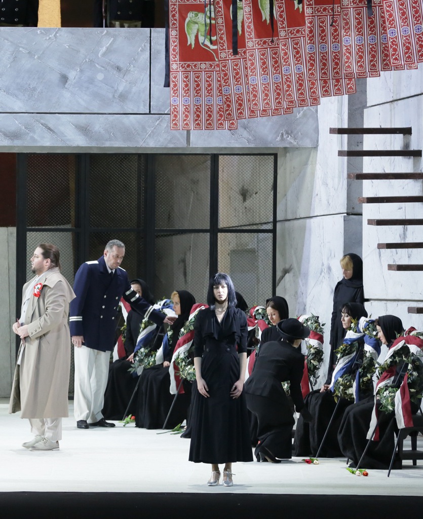 Однако особой радости жителям Кипра благополучное прибытие капитана не приносит. Позади - тяжёлый бой и жесткий природный катаклизм. Разрушения, трупы, вдовы, – такова обстановка, в которой завязывается интрига. И напоминание о гибели моряков как знак трагедии пройдёт по всему спектаклю: женщины в чёрном с портретами погибших присутствуют за стеклянными дверями почти весь второй акт, общаются с Дездемоной (просветлённый хор в начале действия), врываются в кабинет Отелло в момент его клятвы мстить. Яго прекрасно использует этот момент, переключая смысловые акценты, и усиливает психологический стресс своей жертвы. Третье действие совмещает обряд поминовения погибших (венки, вдовы, траурный почётный караул) с приездом послов, отзывом Отелло и его нервным срывом. Музыкально, нужно сказать, всё сходится. По смыслам – тоже. Не сошлись на премьере только певцы в грандиозном ансамбле с хором.