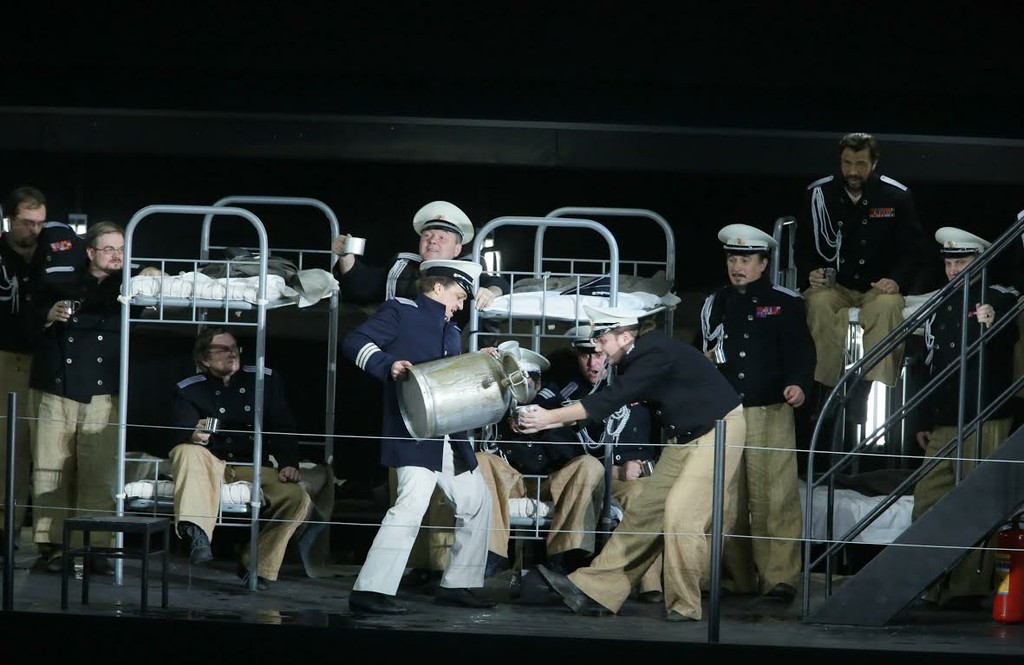 Впрочем, чудеса всё же демонстрировались. В тревожном ожидании корабля Отелло – масса людей на террасе около маяка. Отличное звучание хора. Напряженность пластики. Но вот площадка начинает подниматься, и взору открывается корабельный трюм: тесно составленные нары, матросы, по сигналу тревоги в спешке натягивающие одежду, толпа у трапа – всё это помогает справиться с обычной, трудно преодолимой сценической статуарностью. И вполне согласуется с мощной гергиевской бурей в оркестре. Но впечатление несколько странное – где же находятся люди, наблюдающие за кораблём? На его палубе? Говорят, в разных точках зала возникал разный эффект. Но в этом явно присутствует определённая нелогичность, даже с учетом абсолютной театральной условности. И ещё одно: по режиссёрскому замыслу, в спектакле все мужчины, кроме посла, – военные моряки. Очень близкие к современности офицерские формы у солистов практически одинаковы, и различить, особенно сначала, кто есть кто, довольно проблематично. Но, так или иначе, заданная Верди драматичность ситуации налицо, и появление Отелло из трюма корабля на площади у маяка впечатляет.