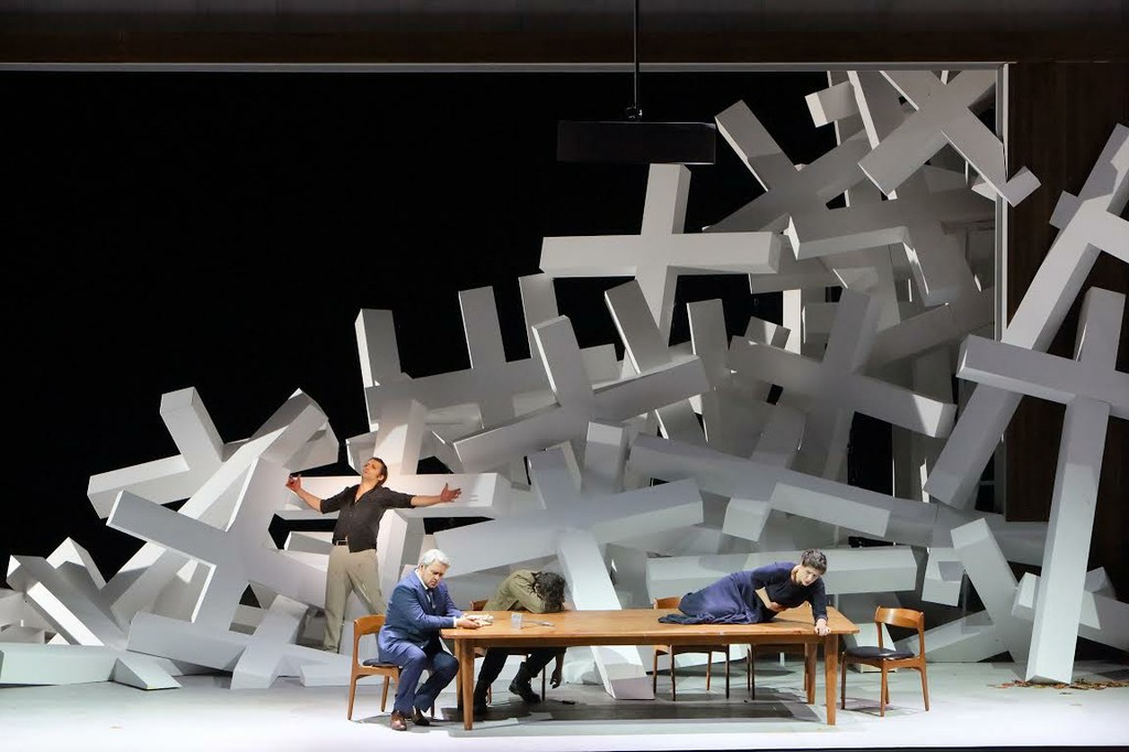 Третья, самая знаменитая ария Леоноры, ‘Pace, pace!’ – решена в спектакле как продолжение этой борьбы с самой собой, борьбы почти безнадежной: Леонора прячется от себя и своей любви, воздвигая баррикаду из массивных крестов. ‘Ma chi giunge?.. Maledizione!’ – это снова и снова проживаемый Леонорой роковой вечер, и она вновь и вновь видит Альваро, пришедшего по ее зову, чтобы разрушить ее мир.