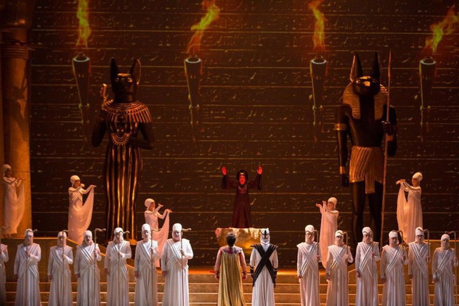 Ирина Долженко – заслуженный и опытный мастер своего дела, она хорошо знает, как надо петь Амнерис, может быть даже слишком хорошо, ибо мастеровитость в данном случае не способствовала какой-то непосредственной убедительности чувства. В этот вечер представилась возможность услышать и опоздавшего на «Порги и Бесс» американца Лестера Линча. Трудно сказать, какой из него Порги, но в партии классического итальянского репертуара певец при всех природных достоинствах своего голоса не всегда находил нужную и художественно оправданную интонацию, его маэстозность зашкаливала. Отчего, подчас, страдала и сфокусированность звука. Рамфис у Михаила Казакова выглядел мощно и фанатично, пред нами был настоящий жрец – партия очень подходит его темпераменту и экстенсивной манере. Не уступал главным героям и солист Казанской оперы Айдар Нургаянов (Царь Египта).