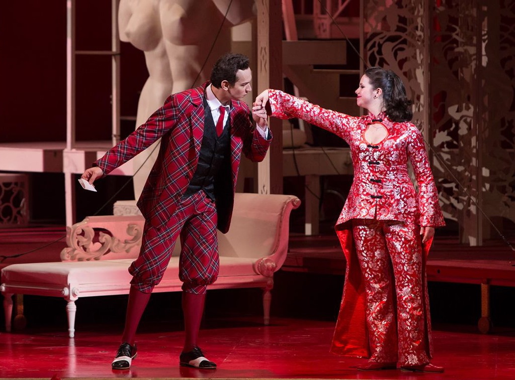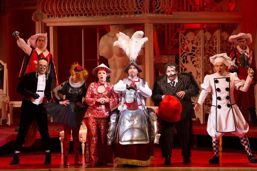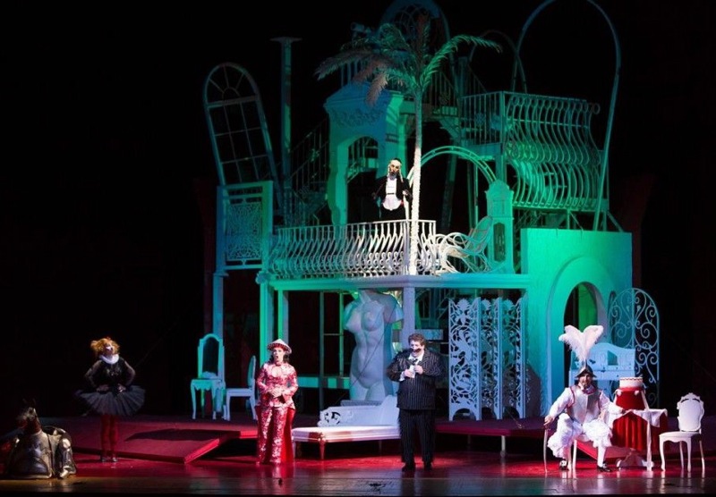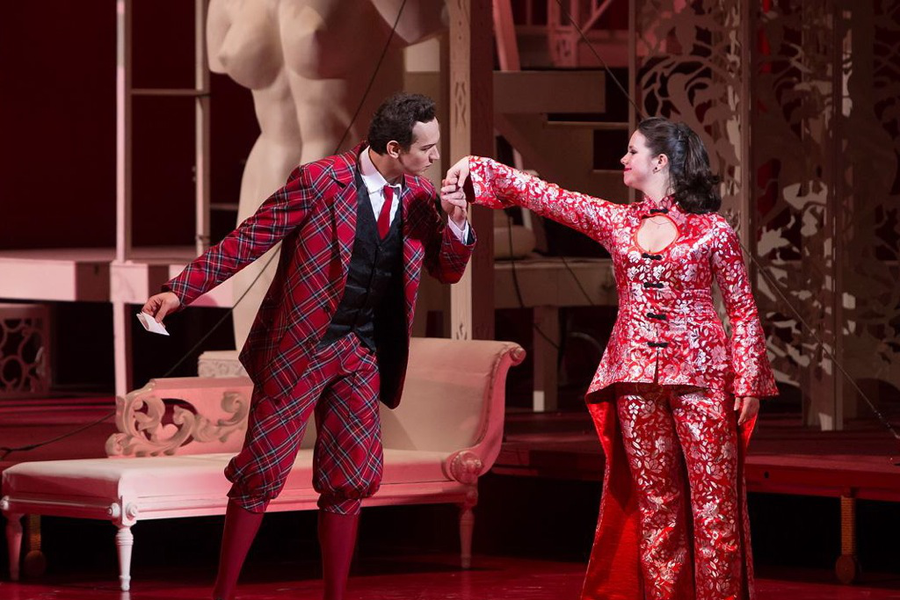 В самом деле, эти бесконечные перевоплощения героев и карнавальные переодевания на сцене (художник по костюмам Елена Бочкова) утомляют и распыляют внимание, озадачивают и вызывают недоумение. У Россини Фигаро – лукавый цирюльник-плут, но весьма добродушный и не слишком корыстный, Розина – кокетка, но вполне невинная и безыскусная, Альмавива – уверенный в себе и вальяжный ухажер, однако не лишенный аристократического благородства. В александровском же спектакле Альмавива – то ковбой, то какой-то странствующий рыцарь-всадник; Фигаро, выйдя в каватине в женском платье, в дальнейшем предстает в образах повара, трубочиста, авиатора эпохи ретро, а в некоторых эпизодах одет в костюм в шотландскую клетку с бриджами и головным убором а ля Доктор Ватсон. Розине тоже досталось – в диапазоне от некоей горячей испанской Карменситы, правда клоунского вида, до вьетнамской девушки. И Бартоло в своих метаморфозах от них не отставал. Им противостоял лишь беспринципный Дон Базилио в неизменном одеянии хасида (!), довольно двусмысленно намекая – в этом изменчивом мире постоянна лишь алчность.