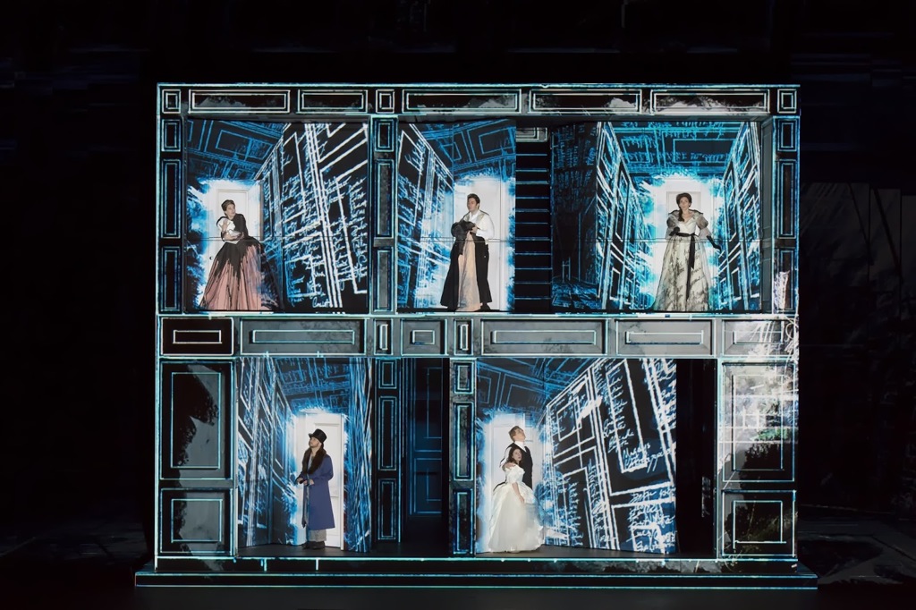 Декорации, разработанные Эс Девлин, представляют собой огромный, двухуровневый, большей частью медленно вращающийся куб, с обилием дверей-панелей, с лестницами и открытыми верандами, напоминающими интерьер загородного летнего особняка. Современные методы видео-проекции позволили режиссеру изменять природу и структуру декораций, а также цветовую палитру, добавив к реальным виртуальные лестницы и двери, бесконечные лабиринты. Так что, в конце концов, было потеряно ощущение и уверенность того – что же на самом деле реально, а что – нет! Апогеем технологической виртуозности в первые же минуты спектакля, уже во время увертюры становятся заполняющие неспешным кривоватым почерком все пространство имена всех дам Дон Жуана, проецируемые на испещренный фасад усадьбы. Как хмель, расползающийся к концу лета по застекленной веранде дома моего детства - под самую-самую крышу.