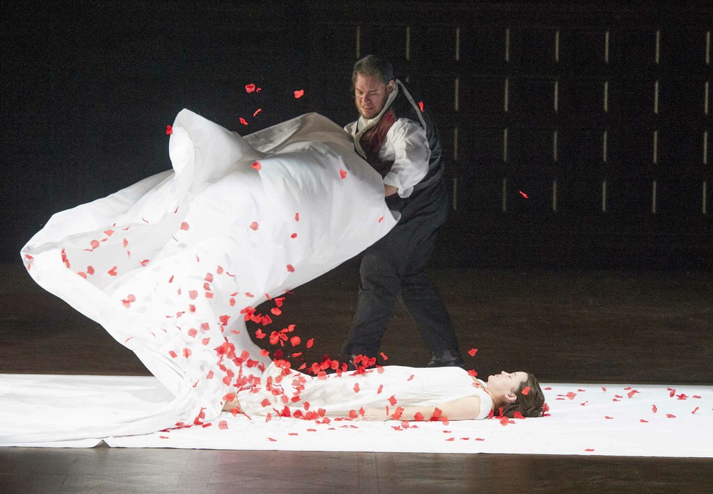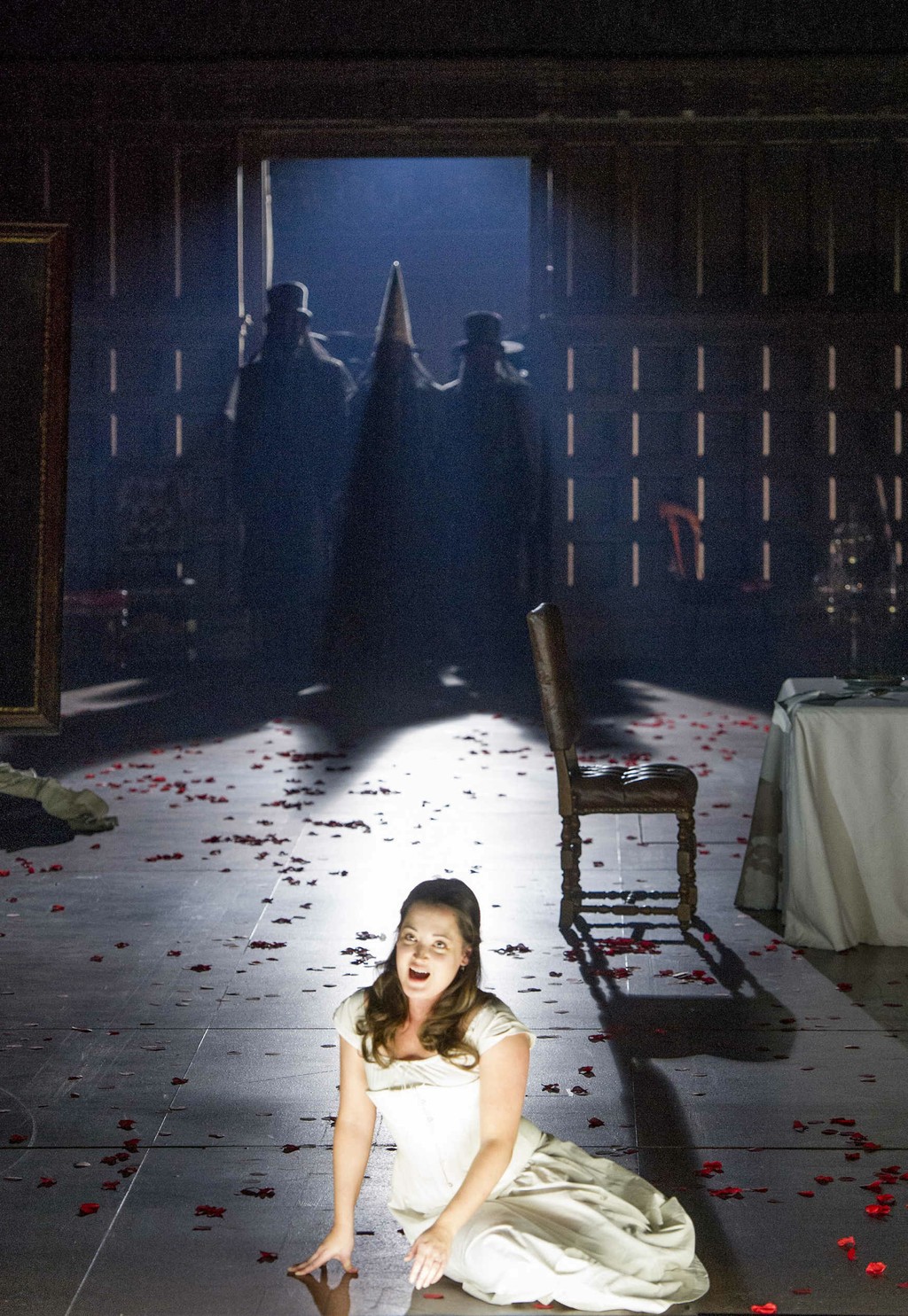 Вся сцена представляет собой огромную гостиную клуба джентльменов викторианской эпохи – с дубовыми панелями, огромнейшим камином, картинами, пальмами, с персидскими коврами (сценография Майкла Левина), словом традиционный набор, которому находится только единственный синоним – очень по-английски. Этот набор не меняется, за исключением нескольких деталей на протяжении спектакля. Нет дворца в Мантуе, нет убогого жилища Риголетто, нет продуваемой всеми ветрами хижины убийцы Спарафучиле. Нет реки, мешка, а Риголетто находит свою умирающую дочь в полупустой гостиной, на и под белыми простынями, обсыпанную лепестками жгучих алых роз! Красиво! Эстетично! И зрителям эта элегантность понравилась.