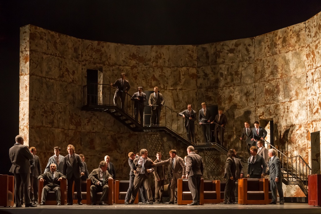 И Александру Тителю и дирижеру Михаэлю Гюттлеру удалось использовать все эти качества музыки Мусоргского эффективно и с пользой, поставив перед солистами, хором и оркестром свои тщательно и до мелочей выверенные и, главное, взаимозависимые интонационно-стилистические и сценические художественные задачи. Пред нами предстал единый и хорошо управляемый многоголосый ансамбль. Это ощущалось, практически, на всем протяжении спектакля. Можно с известной долей условности даже охарактеризовать общий музыкально-интонационный стиль постановки, как аскетично суховатый и колючий, с чутким и острым отношением к ритмической организации музыкальной ткани и паузам. Ни о каких оперных красотах в традиционном понимании здесь и речи быть не может. Это вполне соответствует характеру 1-й авторской редакции, разговор о достоинствах или недостатках которой в сравнении с другими версиями и звучностью инструментовки Римского-Корсакова выходит за рамки этой статьи.