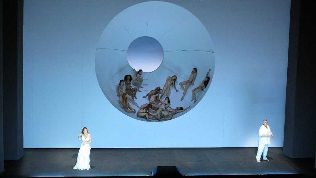Сцена Venusberg (сценография – Пиа Мария Шрайвер и Саша Вальц), на мой взгляд, получилась просто грандиозной: в огромном куполе, напоминающем глазное яблоко, женскую грудь или огромный фотообъектив (у кого какие ассоциации), танцуют полуголые женские и мужские фигуры, происходящее на сцене можно назвать хореографическим олицетворением групповой эротики. Свет в начале полутемный, затем становится все ярче и ярче, достигая максимума при появлении Венеры и Тангейзера. Очень гармонично вовлечена в хореографию Венера, визуально, артистически и вокально. Тангейзер по своим параметрам, в основном вследствие избыточного веса, являет собой полную противоположность хореографическим концепциям, и, тем не менее, он довольно хорошо вписался в сцену в Venusberg.