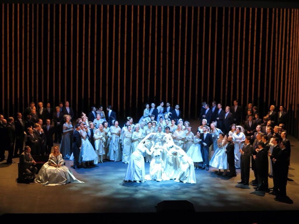 Второе действие происходит в зале, на первом плане которого размещается блок из трех театральных кресел, таких же, как в зрительном зале - собственно единственный интерьер Вартбурга. По краям, с самого потолка свешиваются массивные деревянные балки, которые при появлении гостей модифицируются таким образом, что сцена становится похожей на зрительный зал, и оркестр oкaзываeтся в центре между двумя одинаковыми по форме пространствами. Первая часть второго действия проходит в классическом варианте без использования хореографии. Затем приход гостей и хор "Freudig begrüßen..." сопровождается приемом slow motion, что на мой взгляд, являлется совершенно избыточным. В данной постановке "танцуют все": в балет вовлечены также хористы и все солисты. Проблема в том, что не все вокалисты рождены для балета, да и далеко не всегда балет уместен.