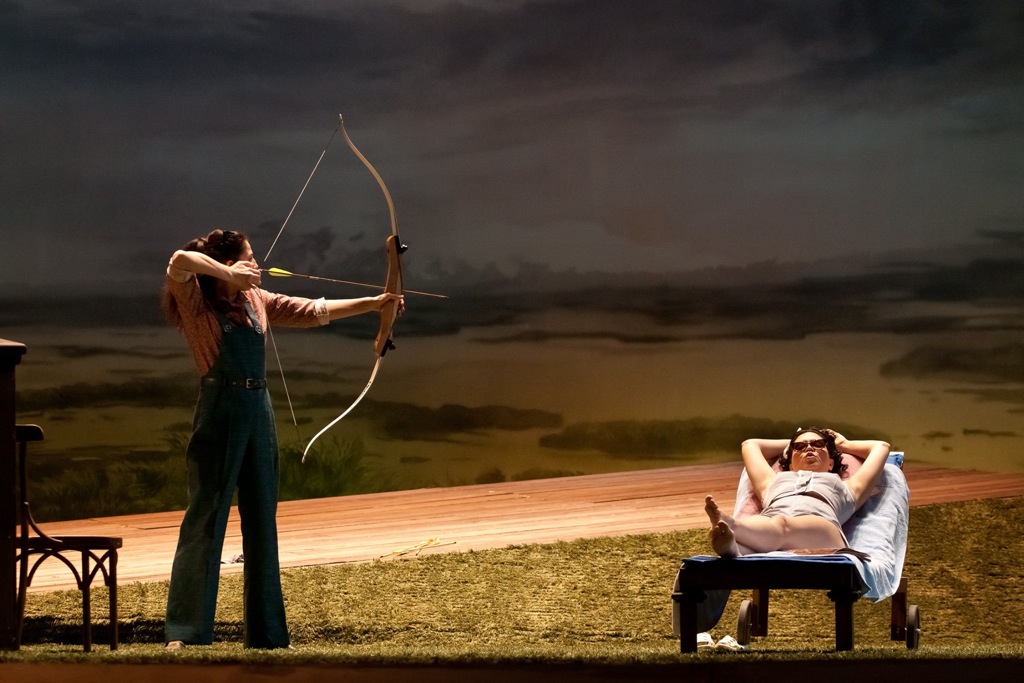 Ряд наивно гипертрофированных аспектов спектакля хотя и способен вызвать добрую улыбку, всё же воспринимается достаточно органично и серьезно. Татьяна, прежде чем предстать перед зрителем в мечтательности с романом в руках, метко стреляет из лука, точно поражая мишень: именно с этого и начинается театральный рассказ. Намек на воинственные качества амазонки? Возможно, и, как мы увидим в полностью уже гипертрофированном решении заключительной сцены оперы, это оказывается вполне логичным. К Лариным «приводит приятеля» не Ленский, а Онегин привозит Ленского на красном, пролетарского цвета, скутере: что ж, и это вполне возможно. На «дачном участке» Лариных – мини-бассейн с настоящей водой. В нем в летний зной Ольга и Ленский, предаваясь любовным объятьям, «мочат ножки», а Татьяна в пылу ночного сочинения судьбоносного послания к Онегину просто физически охлаждает этот пыл: а почему бы и нет?