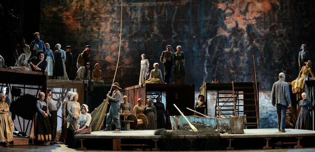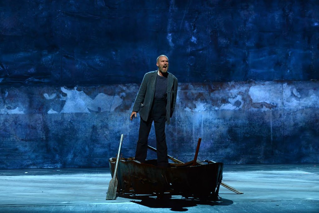 Оглядываясь назад, сам поражаюсь тому, как мало могу сказать про эту вроде бы не одиозную, но безликую постановку, которую осуществил 80-летний маэстро Йоши Оида. Оформление самое минималистское (сценограф – Том Шенк): из декораций на сцене одна ржавая лодка без дна, сиротливо стоящая посреди сцены. Главный герой время от времени садился в неё и грёб вёслами на одном месте. Невольно вспоминалось старинное детсадовское хокку: «Асфальт подо мной, Ноги обуты в лыжи. В чём же причина?» Кстати говоря, как человек, родившийся в Японии, Оида мог бы знать толк в море и понимать, что у Граймса была вовсе не прогулочная вёсельная лодка, в которую и вдвоём-то не усядешься, а крупный рыбацкий баркас, куда свободно могли бы поместиться несколько центнеров, а то и тонн, улова, на котором можно было при необходимости смотаться на базар в Лондон... Ну да неважно.