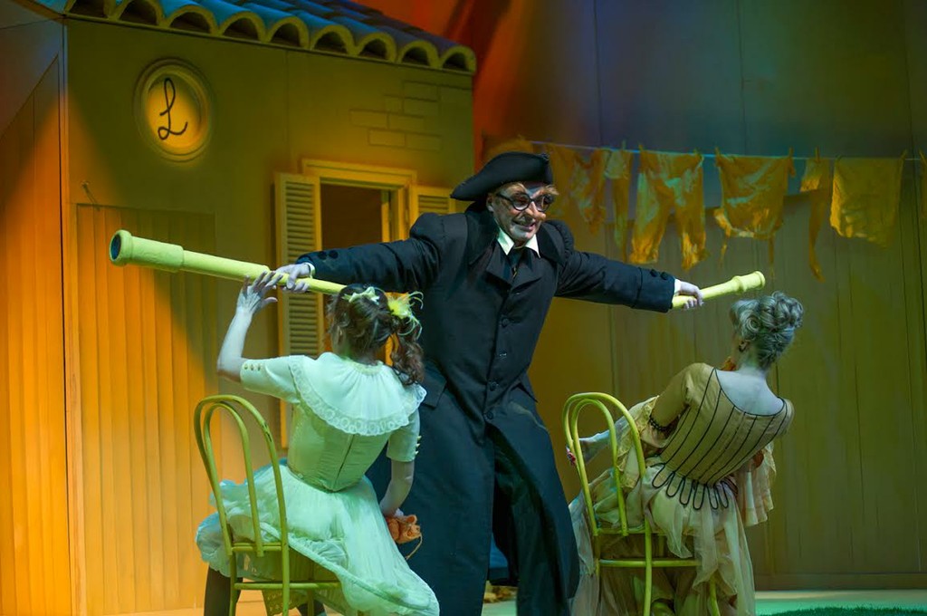 Кажется, в «Четырех самодурах» частично опробована первая примерка такого подхода – пока еще робкого и весьма сдержанного. Конечно, в мизансценах обсуждаемого возобновления превалирует реалистичность, но при этом она весьма эффектно сочетается с удачно найденными пластическими решениями – по своей сути, ассоциативными, абстрактными, но исключительно точно бьющими в цель. Связующими и определяющими символами этой современной комедии dell’arte являются не только гротесково-скрюченные накладные носы четырех самодуров (Лунардо, Маурицио, Симона и Кансьяна), но и прелестный мимический образ, который назван в программе Синьориной Фантазией. Роль вымышленного персонажа-мима, находчиво укрупненная и творчески переосмысленная режиссером, берет старт от единственного прописанного в либретто образа служанки – служанки персонажа по имени Марина (жены Симона, приходящейся теткой Филипето, сыну Маурицио). А коллизия сюжета и состоит в том, что Филипето и Люсьету, дочь Лунардо, отцы-самодуры буквально хотят поженить друг на друге вслепую.