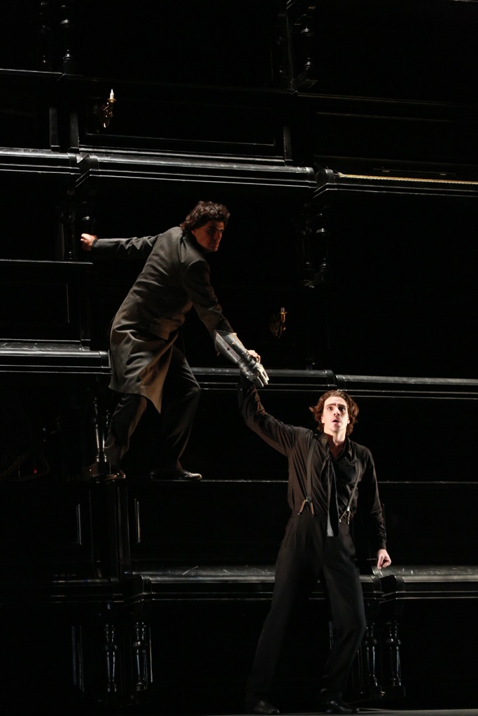 По сути эти два мотива самодостаточны и могли бы исчерпать собой визуальную образность спектакля. Есть, однако, еще кое-что, неожиданно возникающее в начале 2-го акта после переодевания Дон Жуана и Лепорелло и сопровождающее сцену избиения Мазетто. И это кое-что – замечательная находка постановщиков. Вся сценическая конструкция вдруг поворачивается наполовину и становится торцом к зрительному залу – и мы видим, что этот контраст черного мрака и красного света отнюдь не плоский. Между ними есть наполненное переходами и лестницами пространство, загадочное междумирие, в глубине которого происходит что-то, не всегда отчетливо видимое зрителю. Таким художественным жестом нам лаконично дают понять, что не все в мире расставлено по полочкам, что любые человеческие устремления и желания перемешаны внутри каждого из нас в гремучую дон-жуановскую смесь. А дальше домысливайте сами… если хотите, если вам мало гениальной бездны моцартовского музыкально-драматического высказывания.