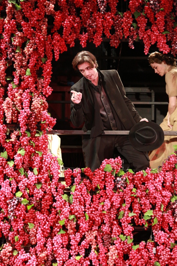 Контрастен к первому и столь же многозначен другой мотив. Он обнаруживается, когда сценическая конструкция поворачивается к зрителю обратной стороной – это стена, увитая гроздьями зрелого красного винограда, олицетворение пиршества и света любви или хрупкого женского начала в духе «Итальянского полдня» Брюллова, но также и плотского пушкинского эротизма: «И вишню румяну / В соку раздавил, / И соком багряным / Траву окропил». Недаром Дон Жуан в сцене ужина так смачно поедает спелые ягоды. В этом виноградном царстве, впервые предстающем пред зрителем в сцене деревенской свадьбы Мазетто и Церлины, ощущается и некая природная безыскусность.
