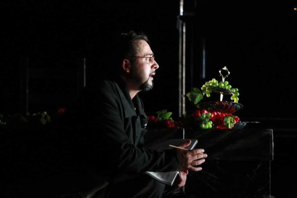 Теперь, после такого пространного вступления читателю будет легче понять, чего же смогли добиться Александр Титель со своей командой в спектакле. Они сыграли, именно сыграли «Дон Жуана», как играют музыкальную пьесу, изобретательно расцветив ее разнообразными театрально-постановочными приемами, подчиненными духу опуса во всей его универсальной безграничности. Спектакль лишен чрезмерного режиссерского апломба, когда постановщик постоянно пытается полемизировать с композитором, претендуя на роль равноправного соавтора и назойливо предлагая свои вымышленные добавочные смыслы. Отсюда – достаточный минимализм сценографии (Адомас Яцовскис) и вневременная условность обстановки, усиливаемая соответствующими костюмными решениями (Мария Данилова). При этом концепция, заключенная в смысловой и визуальной символике художественного оформления и мизансцен, безусловно, необходимая для содержательности и цельности представления и без которой невозможно зрительское восприятие синтетического оперного жанра, имеет место быть! Только вытекает она из самих свойств моцартовского искусства, не требует напряженной работы сознания для своей расшифровки и своим общим художественным строем апеллирует не к разуму, а к чувству, отчего «прочитывается» интуитивно.