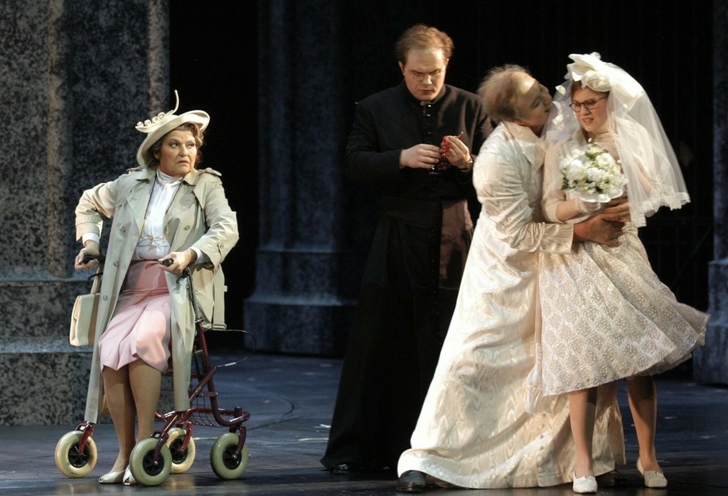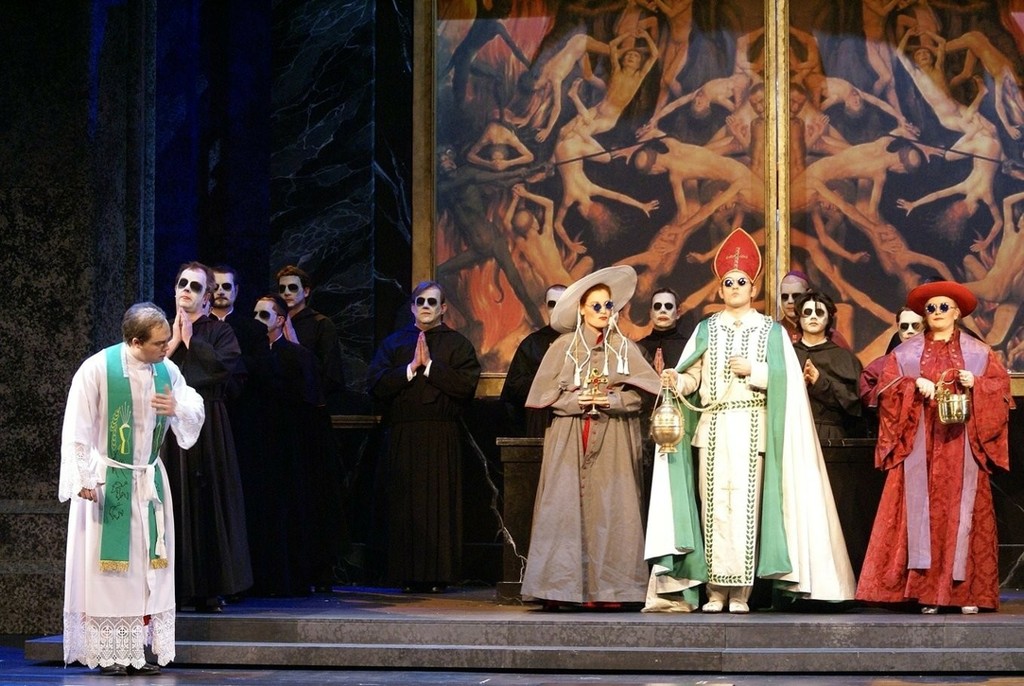 а Лепорелло — в облаченного в епископские одежды служителя развратного культа. Прихожанки и прихожане храма, в котором разворачивается вся эта вакханалия с упивающейся вдрызг «статуей» Девы Марии и Архангелом Михаилом, ошарашенным обезоруживающей наглостью оперных персонажей, — лишь статисты, добровольно приносящие свою добродетель на алтарь сексуальной невоздержанности главного героя.