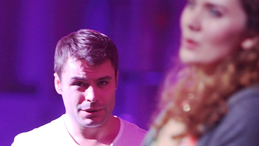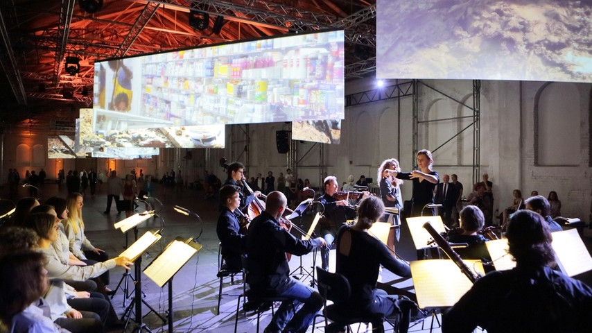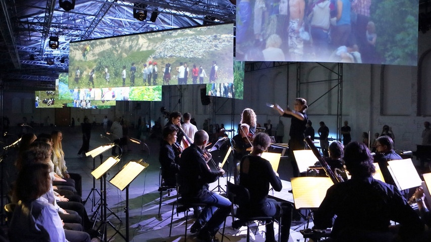 Противоречивые характеры героев блестяще раскрыли участники квартета молодых солистов Тим Куперс (рыбак), Юлия Мария Дан (девушка), Миклош Шебештьен (банкир), Ден Поуер (юноша). Каждый из певцов убедительно озвучил музыкальные портреты людей, оказавшихся на грани пропасти, поставленных перед выбором. Действуя на самом краю сценического подиума, плотно заполненном оркестром и хором, певцам удалось втиснуть в узкое пространство сцены неимоверное множество деталей, составляющих истинную театральность: напряженную динамику личных взаимоотношений, сценическую многоплановость, монтажность фрагментов и ситуаций, чреватых стремительным переключением планов. Нельзя не отметить, что пронзительный ритмический тонус музыки косвенно перекликался с визуальным фоном Эрнаута Мика. Видеосюжеты и действие оперы объединяла общая нервная атмосфера ожидания, тревоги, страха. Наблюдение за этим перформенсом не мешало сосредоточиться на развитии самодостаточного акустически-выразительного феномена радио-оперы. Захватывающий интонационный конфликт чувственности с жесткостью составил основу музыкального сюжета этого миниатюрного 30-минутного спектакля. После генеральной паузы оркестра, показавшейся некой «черной» дырой» во времени и пространстве Reithalle, все события заново повторились «с начала до конца», как бы с нового отсчета времени. Публике была предоставлена возможность понаблюдать за ходом действия с иного ракурса. Сценический подиум после остановки продолжил свое путешествие по Reithalle в обратном направлении.