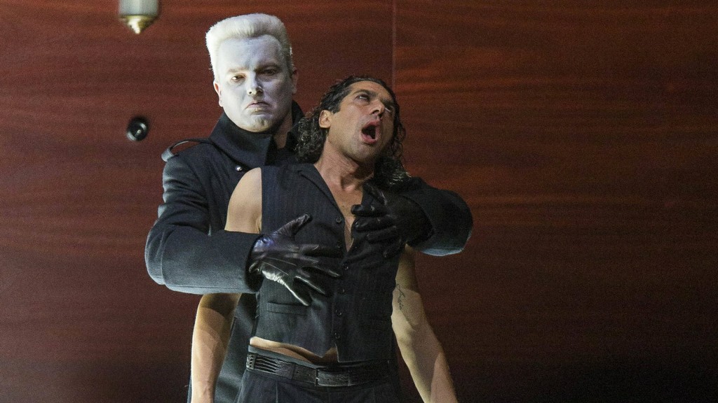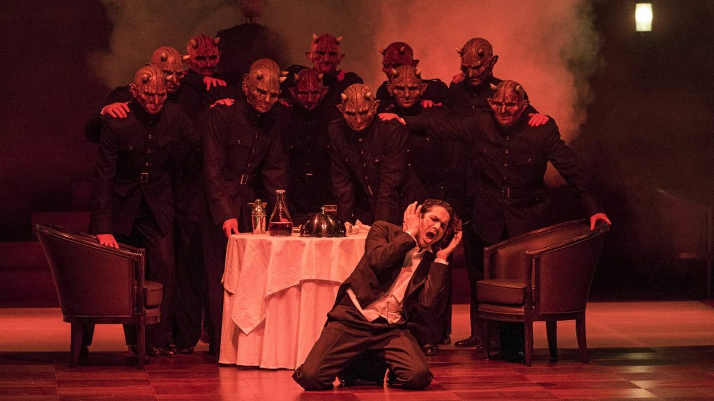 Но ключевым лейтмотивом постановки, на мой взгляд, становится образ чёрта. В этом образе можно усматривать автобиографическую гримасу режиссёра, игравшего чёрта здесь же в Зальцбурге в знаменитой и неувядающей мистерии Гофмансталя «Имярек» (“Jederman”), но мне видится совершенно остроумный зигзаг всё той же капитуляции постановщика, любой ценой пытающегося обмануть первоисточник. В данном случае, эта капитуляция оказалась настоящим гамбитом. Ибо образ чёрта, неожиданно возникающего за барной стойкой (!), потом мультиплицируется в инфернальной кульминации оперы в настоящее адское видение главного героя. И если бы у Бехтольфа хватило зрительского мещанства на окончательное «доделывание» этой сцены, то блестящая цитата финала лондонского спектакля Франчески Замбелло прозвучала бы намного увесистее и убедительнее. Достаточно было вывести на сцену «доктора». Но Бехтольф не пожелал (вряд ли не смог) придать своему спектаклю буржуазную завершенность, и очень многие детали, эстетически роскошные, но драматургически неуместные провисли иллюстративными па в партитуре весьма остроумного пастиччо из лучших постановок прошлого.