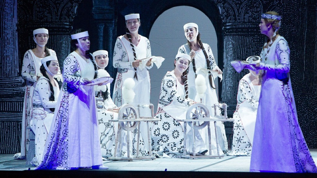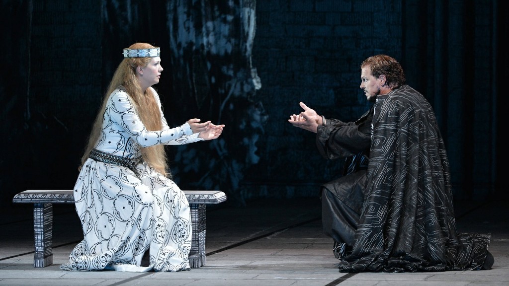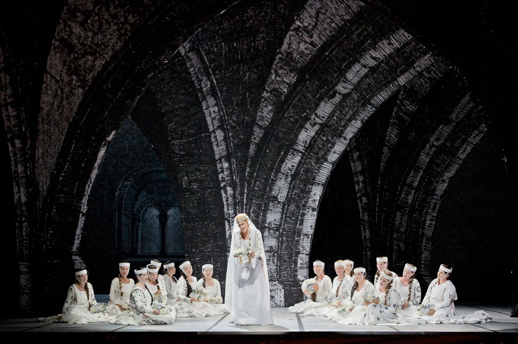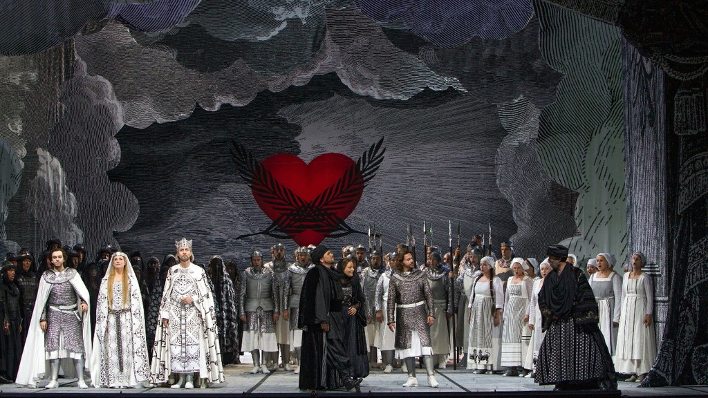 Конечно, нет ничего зазорного в том, чтобы упаковать ходульную средневековую пропаганду в эстетически безупречную гравюрную монохромность (сценография Фердинанда Вёгербауэра), но опера Шуберта-Купельвизера – весьма условно может быть отнесена к прямолинейной агитации. И черно-белый перегиб в костюмах (художник Аннамария Райнрайх) как основной инструмент репрезентации идеи интерпретатора в данном конкретном случае выглядит просто странно, обличая выдающегося режиссёра в очевидной невнимательности к первоисточнику. Ведь только совершенно нечуткий человек, ознакомившийся с «Фьеррабрасом» не заметит, насколько резко контрастирует этически сомнительное поведение «белой» пары влюбленных - королевской дочери Эммы её избранника Эгингарда - с благородством поведения «чёрного» рыцаря Фьеррабраса и с самоотверженностью «чёрной» же мавританской принцессы Флоринды! Неужели Петеру Штайну не нашлось что сказать по этому поводу? Почему символическое сердце в финале перечеркивается именно чёрными перьями? Ведь неслучайно же это грубое цветовое противопоставление так режет глаз…