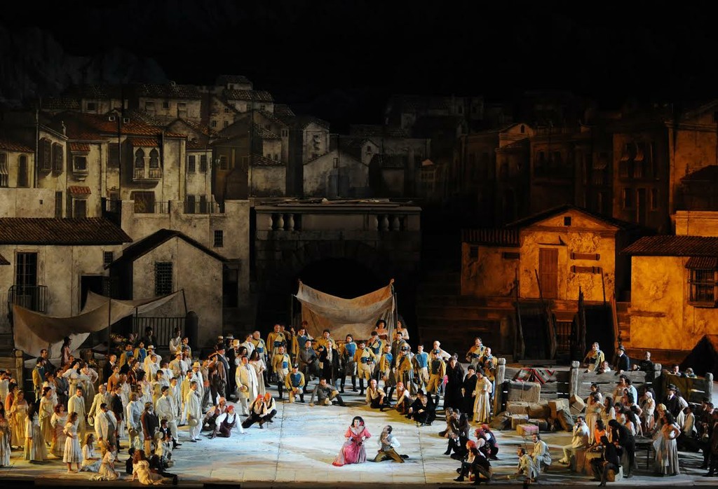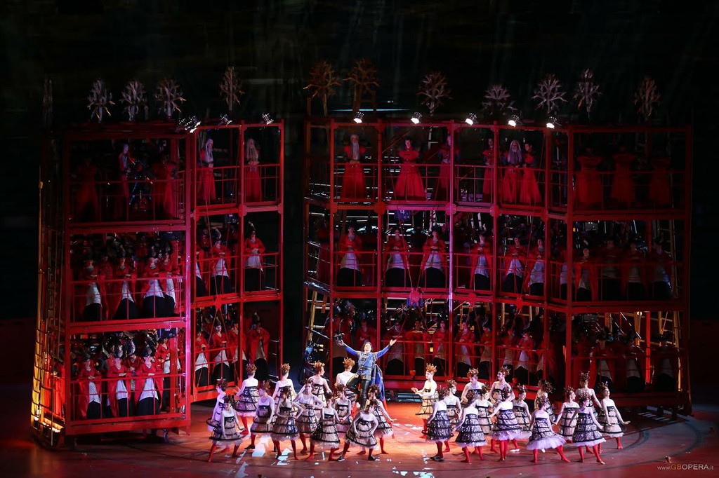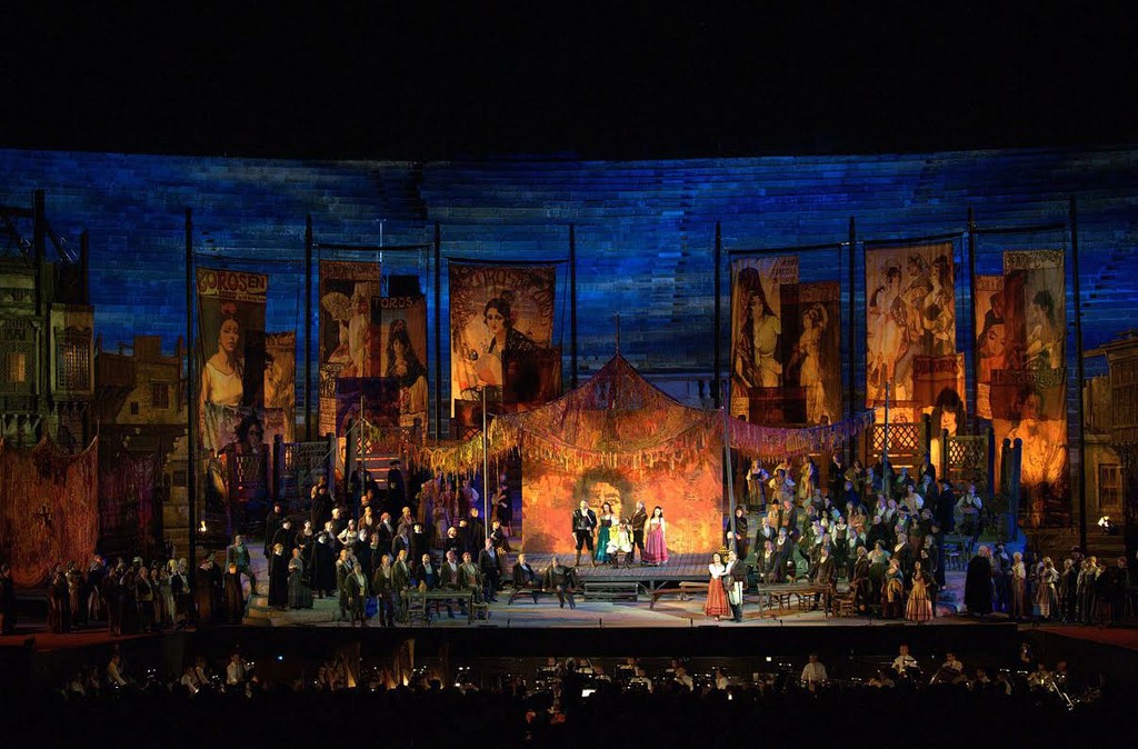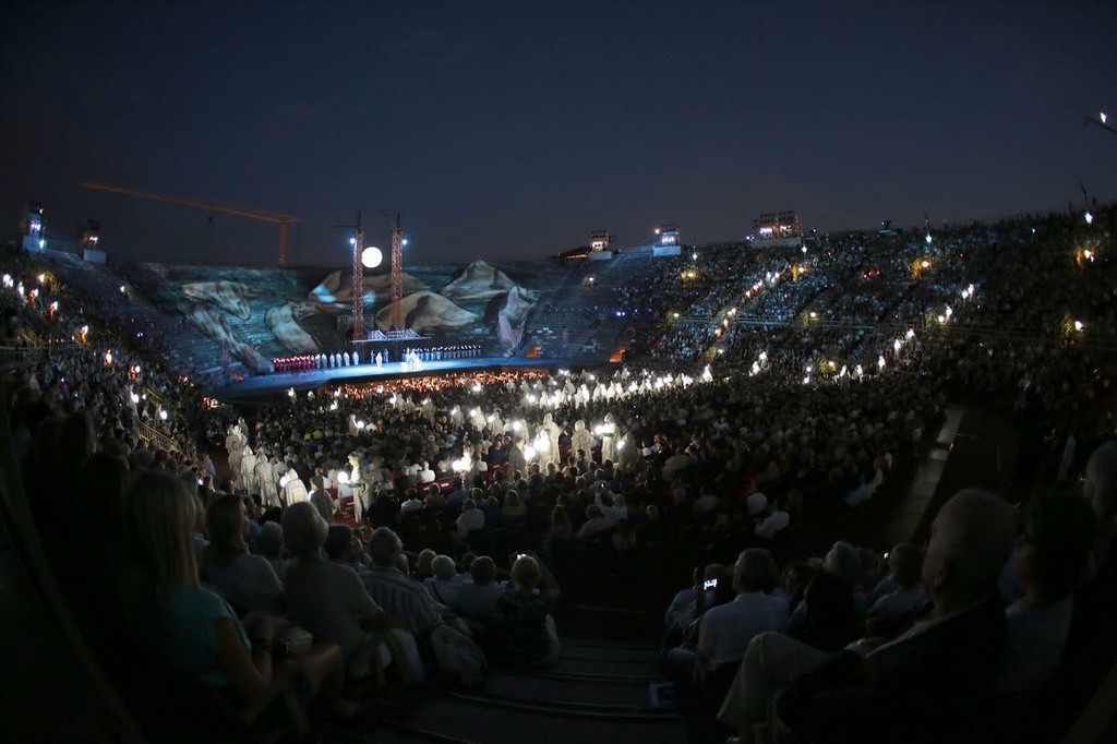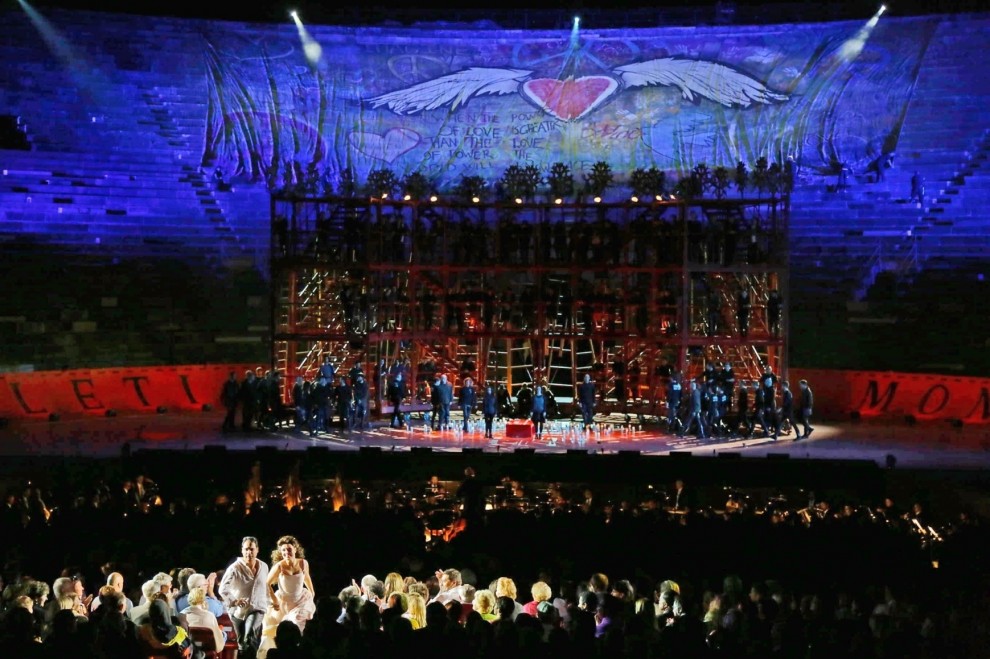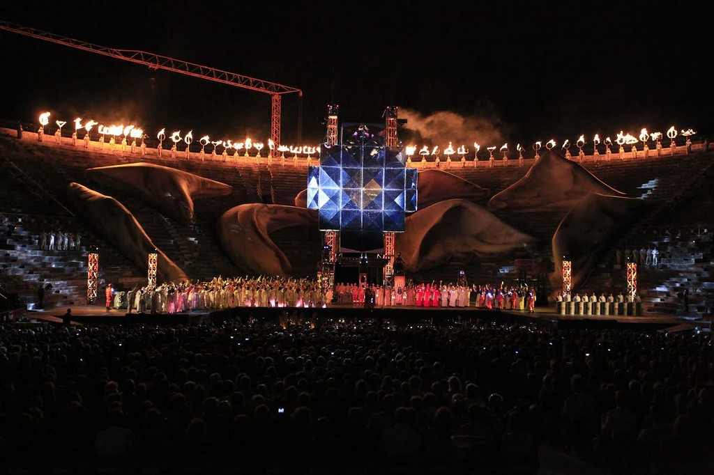 Когда речь идет об Арена ди Верона, самом прославленном театре под открытым небом, без крылатой пушкинской фразы «он вечно тот же, вечно новый» не обойтись. С поправкой на женский род, ведь Арена – она, Синьора Арена. Если придать этой фразе вопросительный оттенок, то ответ будет коротким - «вечно та же». Как всегда, когда речь идет о долго существующих и бесконечно повторяющихся вещах, в них есть много приятного, мирного и успокоительного. Список прокатываемых в Арене названий невелик (в основном это оперы Верди и Пуччини, к коим иногда добавляется «Кармен», а в последние годы «Ромео и Джульетта» Гуно, два года назад публику «одарили» роскошнейшим и скучнейшим «Дон Жуаном» в постановке Дзеффирелли), и от оперного преставления всегда знаешь, чего ждать. В принципе, попытки обновить привычное зрелище в Арена ди Верона крайне редки и заканчиваются они, как правило, несчастливо, достаточно вспомнить ужасающую «Аиду» 2007 года в постановке телевизионного режиссера Джампьетро Солари или продукт образца года 2013, бездушно-механическую «Аиду» каталонской театральной группы La Fura dels Baus.