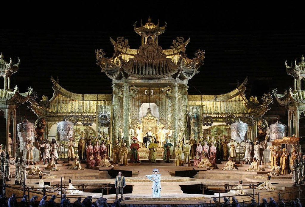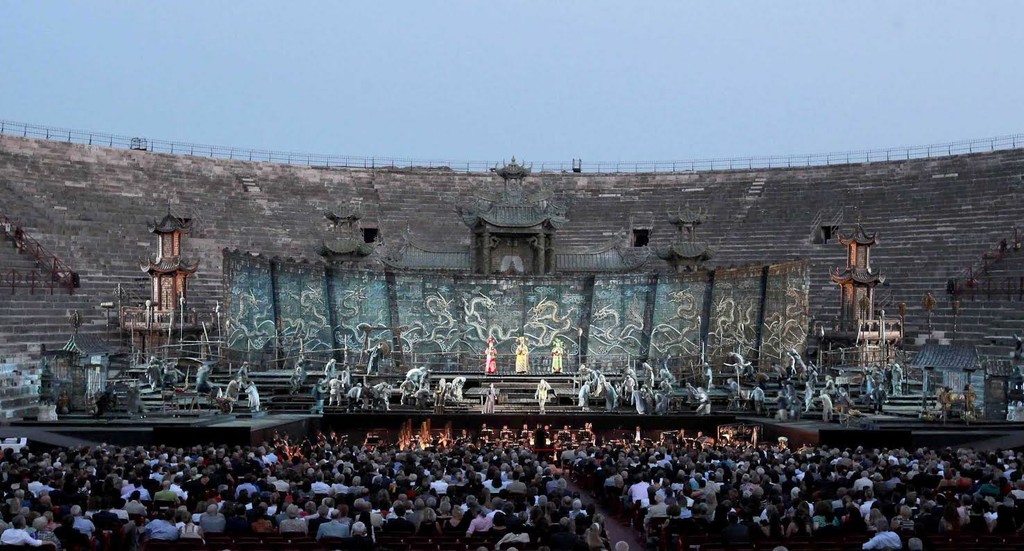 В «Турандот» публика особенно удивляется поразительному зрелищу во втором действии, когда ее глазам предстает сияющий золотом императорский дворец. «Турандот» золотая, сияющая, грандиозная – так когда-то написала автор этих строк об этом спектакле Дзеффирелли. Такова она и сегодня. В спектакле торжествуют принципы, которые престарелый художник всегда отстаивал и за которые сегодня все еще готов броситься в бой. Эти принципы характеризуют упомянутый стиль kolossal, в котором выдержаны все постановки Дзефиирелли на такой грандиозной площадке, как Арена ди Верона. В «Турандот» глаза зрителей не выдерживают ослепительного сияния, которое испускает императорский дворец. Что рядом с его блеском весь остальной мир? Только серость и ничтожность. Особого признания заслуживают костюмы Эми Вада, которая получила «Оскара» за работу над фильмом Акиры Куросавы «Ran». Боязнь пустоты, похоже, с возрастом у тосканского режиссера увеличилась: количество статистов и хористов, марширующих по сцене, превосходит всякое воображение. Шествия Мастер считает неотъемлемой частью «великой итальянской оперной традиции». В «Турандот» все предсказуемо, но справедливости ради надо признать, что подобная постановка и есть фирменный стиль Арены и вызывает восхищение у преимущественно туристической публики.
