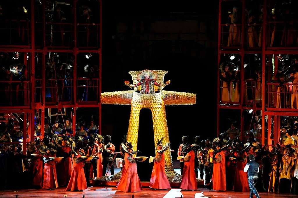 «Аида» — фирменный бренд фестиваля и, думается, критикам, в обязанность которых входит каждый год ее описание, порядочно скучно. В минувшем году наряду с «исторической» «Аидой» в декорациях, восстановленных по эскизам 1913-ого года, давали новую «Аиду» в постановке каталонской театральной группы La Fura dels Baus, помпезно объявленную «Aida del Centenario», в приблизительном переводе «Аида» сотой годовщины» (фестиваль стартовал в 1913 году, и в году минувшем праздновали его столетие). Что сказать?