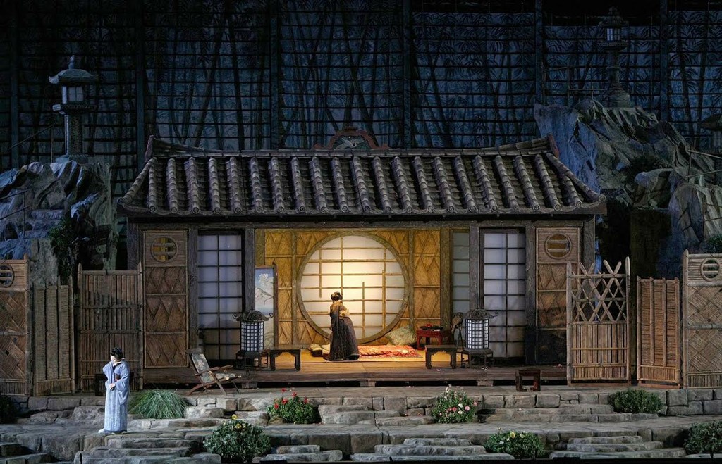 В «Мадам Баттерфляй» (постановка 2004 года и первое обращение Дзеффирелли к этой опере Пуччини) престарелый Мастер одержим стремлением создать на сцене иллюзию подлинного Нагасаки, в котором живет неисчислимое человечество, занятое мышиной возней, зарабатыванием на хлеб насущный. Сценография Дзеффирелли в «Баттерфляй» может пленить, хотя и не являет ничего абсолютно оригинального. Он закрывает ступени амфитеатра позади сцены огромным «задником» из девяти расписанных панелей. Скалистые горы, башенки, деревья, дракон, ниша со статуей божества... Но «задник» скрывает в себе сюрприз: истинное место существования женщины-бабочки в роли временной жены западного человека, домик, сродни карточному, купленный «на девятьсот девяносто девять лет». Внутри домика – самое скромное убранство, но он испускает свет, как излучает его душа героини. В мгновение отчаянной надежды или предельной концентрации душевных сил это сияние дополняется еще одним – позади сценической конструкции, на ступенях вспыхивают сотни синих огоньков, может быть, это блестит море, откуда должно прийти спасение.
