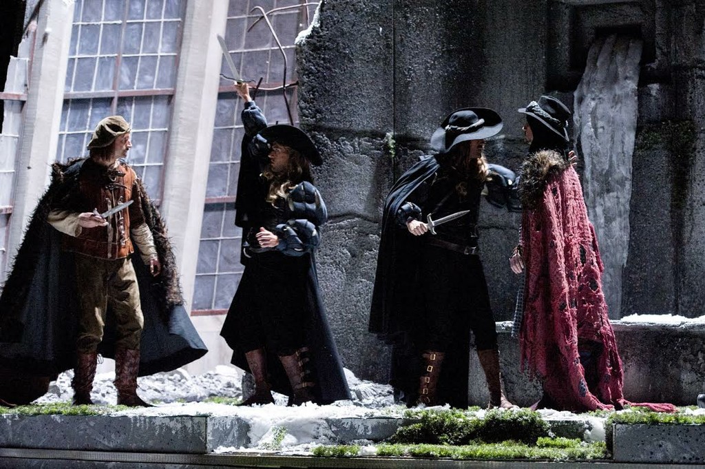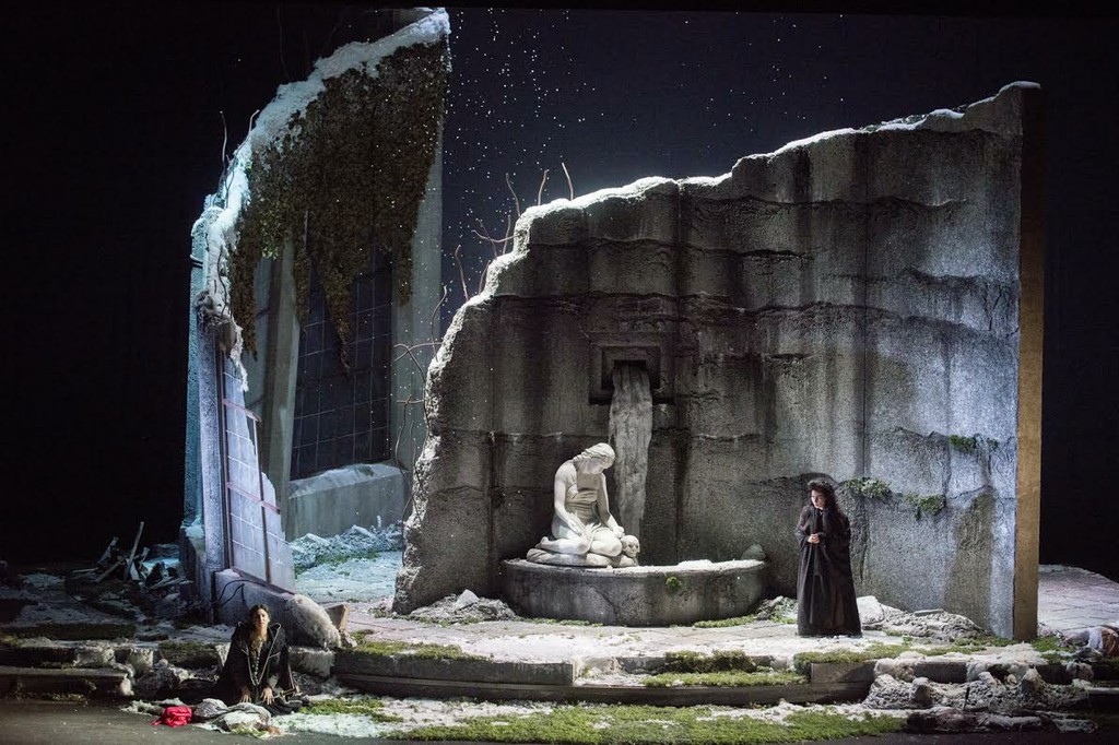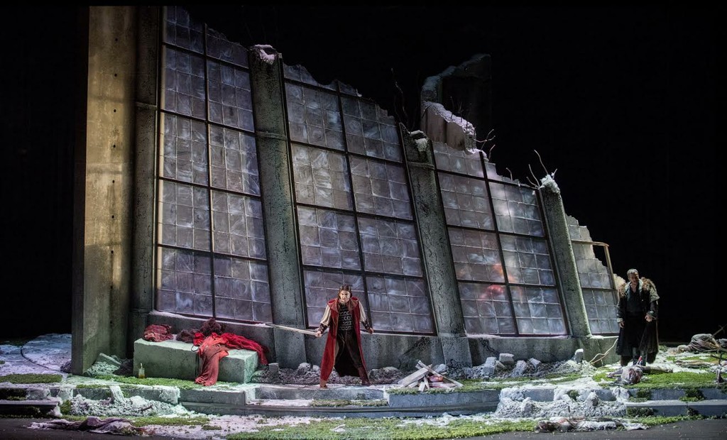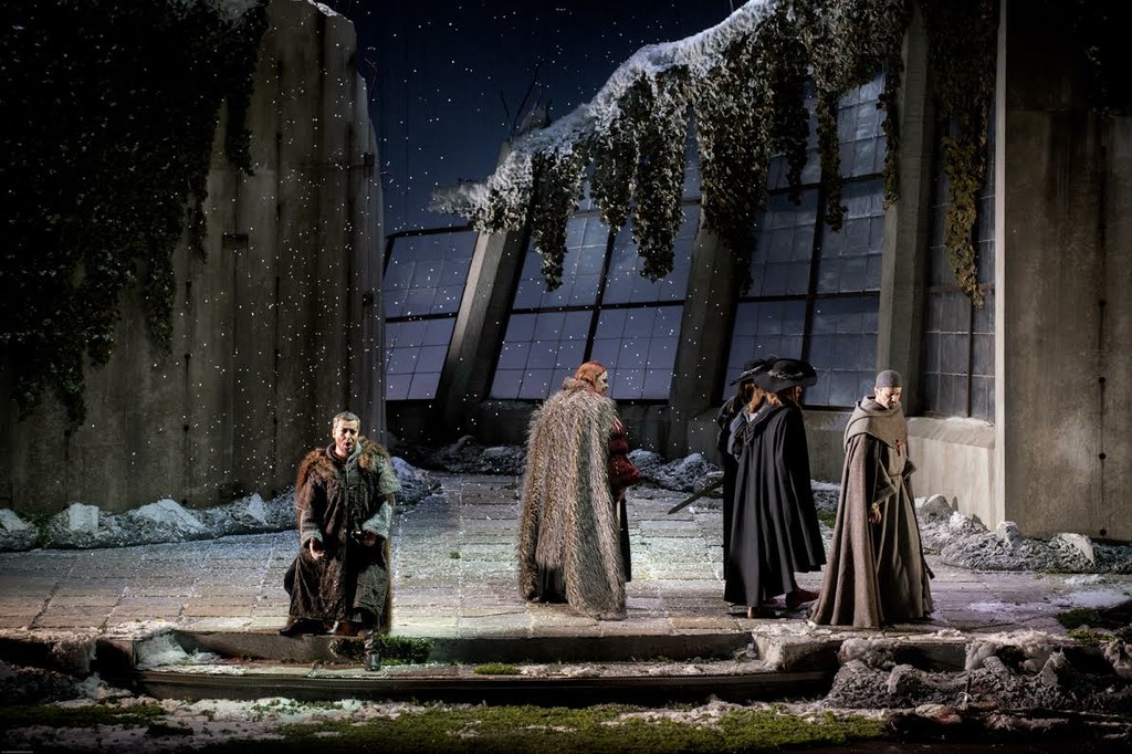 Сценограф Анджело Сала погружает зрителя в ультраромантическую и преувеличенно мрачную атмосферу. Не обязательно Шотландия, а некая холодная, пустынная, разоренная, безутешная северная страна, где, видимо, прошла ужасная война... две полуразрушенные стены, выдающие свою железобетонную природу, заброшенный фонтан, серые камни, мох, снег, замерзшая вода, валяющиеся повсюду трупы. Время действия точно не определено, как если бы речь шла о вечности, в полном согласии с этой идеей выполнены живописные костюмы Альфредо Корно, с использованием мехов. Кто-то носит средневековое платье, а кто-то разодет в костюм семнадцатого века.