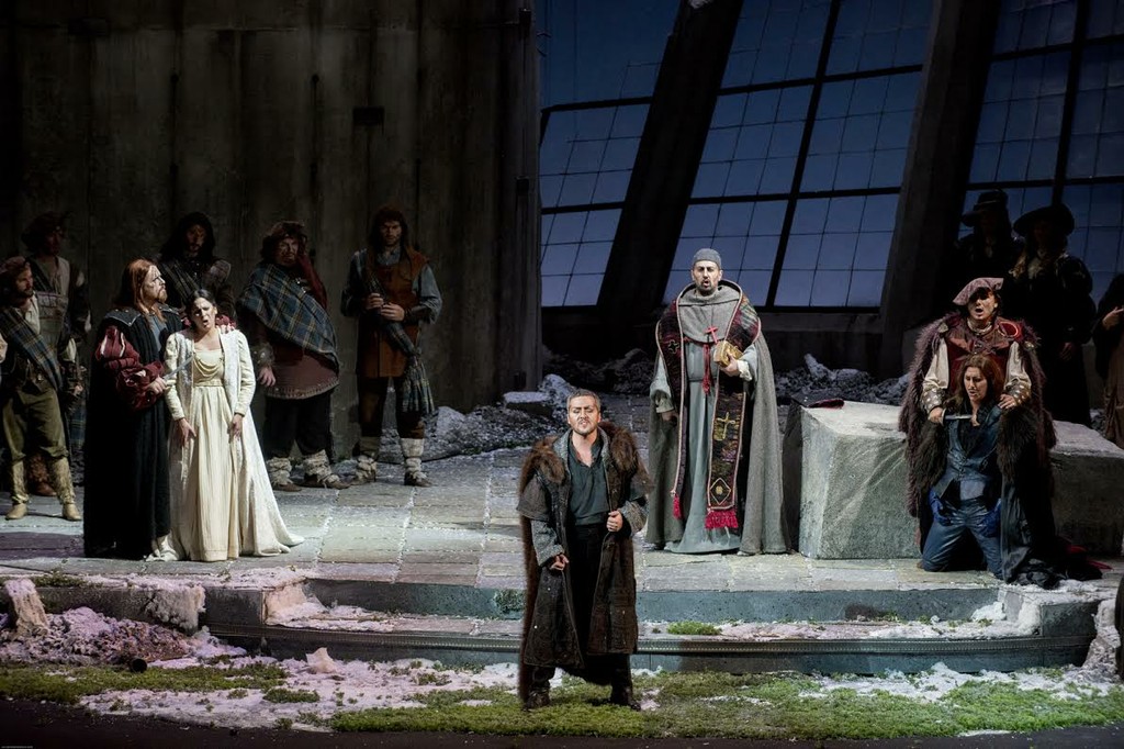 Режиссер Франческо Беллотто (он же художественный руководитель Bergamo Musica Festival) не делает зрителю роскошного подарка, но и не огорчает. Эта «Лючия» может быть признана вполне традиционной, если не считать «шутки», которую Беллотто сыграл с Алисой: из доверенного лица Лючии она превращена в ведьму, взятую «напрокат» из «Макбета». На фоне оркестрового вступления Алиса в сопровождении товарок «шастает» в окрестностях полуразрушенного замка и отрезает руку у одного из валяющихся на земле трупов с целью снять с нее кольца. Именно этими кольцами обмениваются впоследствии несчастные влюбленные, а с отрезанной Алисой рукой появляется Лючия в сцене безумия.