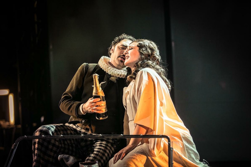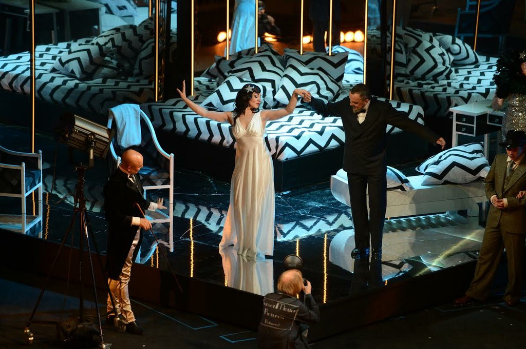 Поначалу, особенно в первом акте, кажется, что на наших глазах снимается какой-то абстрактный фильм, совсем иная история, нежели история кавалера Де Грие и Манон Леско. Однако в финале второго акта камера сценического оператора явно направлена уже не на специально ставящиеся в студии эпизоды, а на реальную драму героев, ворвавшуюся на сцену в пространство съемочного павильона из жизни. И именно в этот момент становится понятно, что сюжет снимаемого фильма – однозначно сюжет оперы Пуччини «Манон Леско». Третий акт в силу своей сумбурности снова несколько сбивает к истории с другим фильмом, но четвертый, когда сама жизнь дописывает и перекраивает сценарий по одной лишь ей подвластным законам, съемка фильма по опере Пуччини «Манон Леско» возобновляется, как раз и завершаясь смертью главных героев.