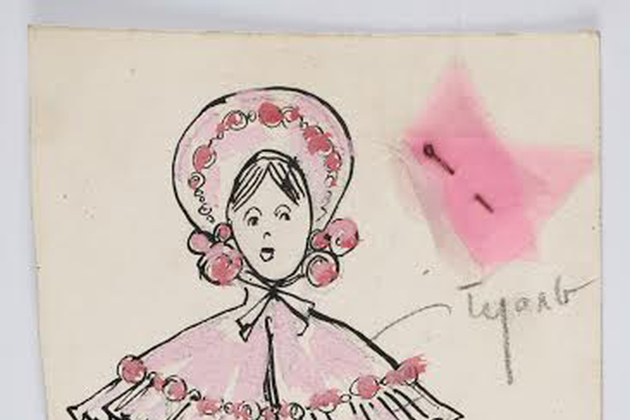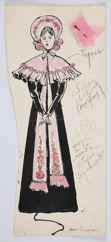 Ну и все же эскиз костюма дочки Подточиной (это один из пяти эскизов, сохранившихся в архиве театра). У Талалая она куда жизнерадостнее выведена, нежели у Гоголя, у Шостаковича и у Покровского.