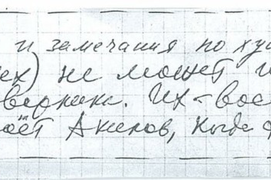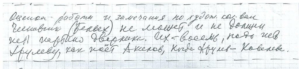 Почерк у Покровского вроде ясный, но все же расшифрую: «Чиновник (Белых) не может и не должен петь партию дворника. Их – восемь, надо петь Хрулеву, как поет Акимов, когда Хрулев – [поет] Ковалева». Что это значит? Не хотел Хрулев петь дворника? Не знаю, но скажу по секрету, что в театре есть разные точные зрения на незыблемость принципа совмещения солистами работы над партиями с пением в хоре и даже с выходом в мимансе. С течением безжалостного времени соблюдать принцип все сложнее, не всякий певец жаждет быть «синтетическим артистом».