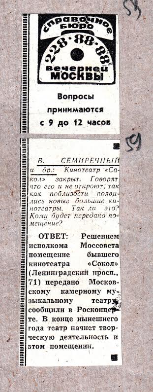 Второй – актеры в Камерном до сих одновременно и сольные партии поют, и в хоре участвуют – поэтому, собственно им надо переодеваться. Стоит сказать, что этот ставший идеологическим принцип имел простое бытовое основание. Камерный театр возник на базе Гастрольной оперы Росконцерта, где по эргономическим, как ныне бы выразились, соображениям логично было роли совмещать. Чтобы меньше народу в Иркутск и Челябинск везти. И в самом новообразованном Камерном театре, который появился в 1972-м, до 74-го не имел помещения… вот, кстати, место для хорошей вырезки из «Вечерней Москвы» от 29 июля 1974-го: