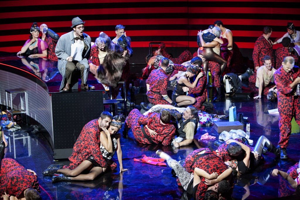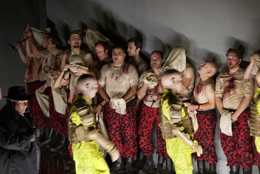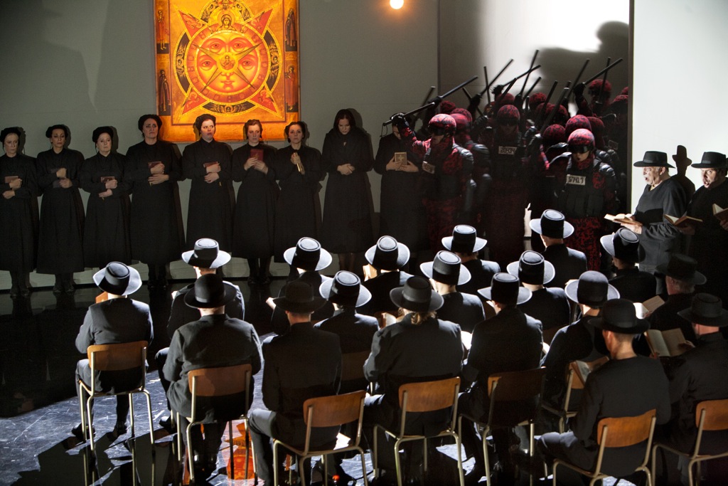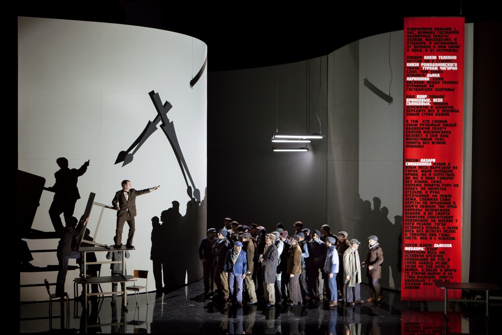 В этом ему помогли сценограф Поль Штейнберг, художник по костюмам Констанс Хофман, художник по свету Адам Сильверман и хореограф Давид Лаэра. Полный уход от исторической реалистичности локализует сюжет оперы, говоря языком математики, в пространстве «цилиндрических координат». Оно и порождает холодную и пустую абстракцию искривленных поверхностей в виде огромных во всю высоту сцены ширм. Как правило, эти ширмы-панели присутствуют в паре, создавая выпукло-вогнутые контуры инфернально-зловещего пространства, и эта сценографическая абстракция исправно модифицируется от действия к действию: ширмы-панели – иногда за закрытым занавесом, а иногда и на наших глазах – просто банальнейшим образом меняют свое взаиморасположение. Эта игра с перестановками и отдельными добавлениями «театральной мебели» сначала приглашает нас в офис «посреди бела поля» с нагромождением столов и стульев, в котором снуют «секьюрити»: это стрельцы в форме омоновцев, но не в «зеленке», а в пестром красно-черном камуфляже.