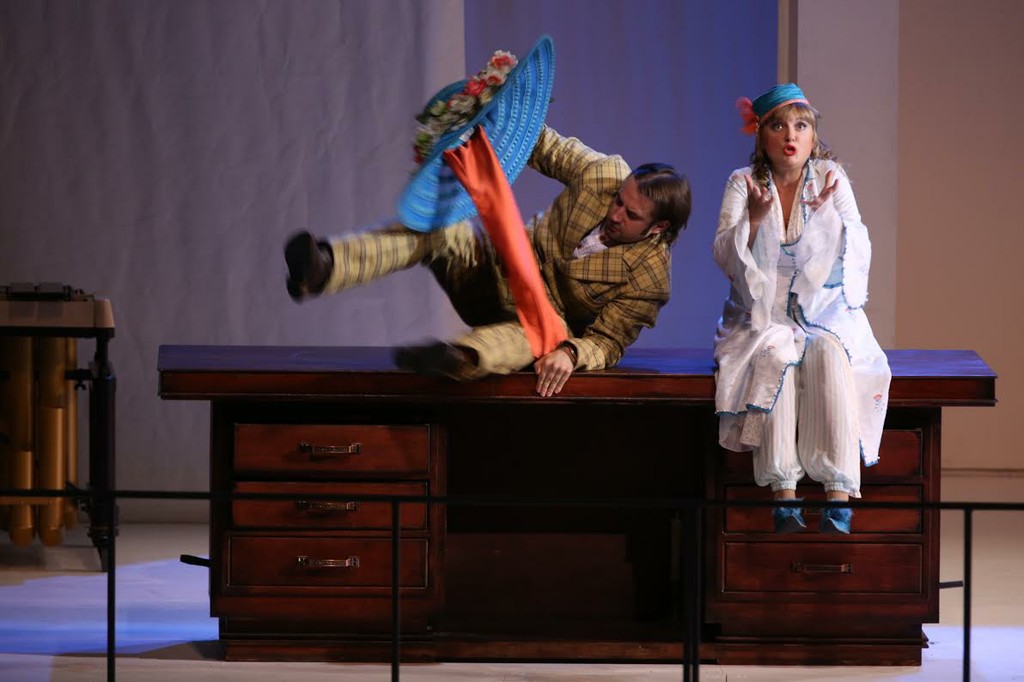 Вот с решения её эротических запросов в виде пантомимы с неким поклонником и можно начать список «грехов» Алена Маратра. Ничего противонравственного персонажи пантомимы не совершают. Пока Берта поёт свою единственную арию, она успевает ответить взаимностью воздыхателю с букетом и увлечь его в кулисы. Ну, в общем, её ария – не монолог Отелло, отчего же не пошутить. Но дальше идёт знаменитый оркестровый эпизод грозы, тоже отданный Берте и её кавалеру, которые, выясняя отношения, в порывах воображаемого ветра носятся по сцене с вывернутым зонтиком. Какой уже там оркестровый шедевр, не до него. Увлекая зрителей пластической сценкой, режиссёр как бы извиняется за предписание Россини - слушать! Увертюру, кстати, тоже приукрашивает постановочная выдумка: дама и господин из галантного века в белых нарядах, спускаясь на подвесном балконе, очень изящно согласуют жесты с музыкой, разрисовывая голубой театральный небосвод белыми птицами и облаками. Но дама с господином до самых поклонов на сцене вообще больше не появляются. И никакими смысловыми или стилистическими перекличками с этим эпизодом в спектакле даже не пахнет!