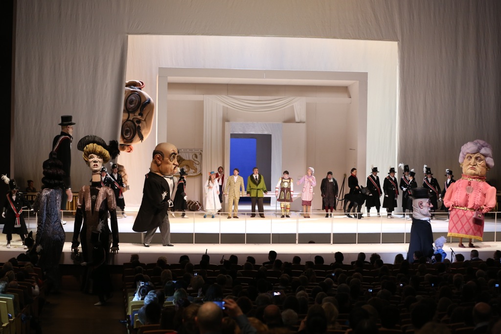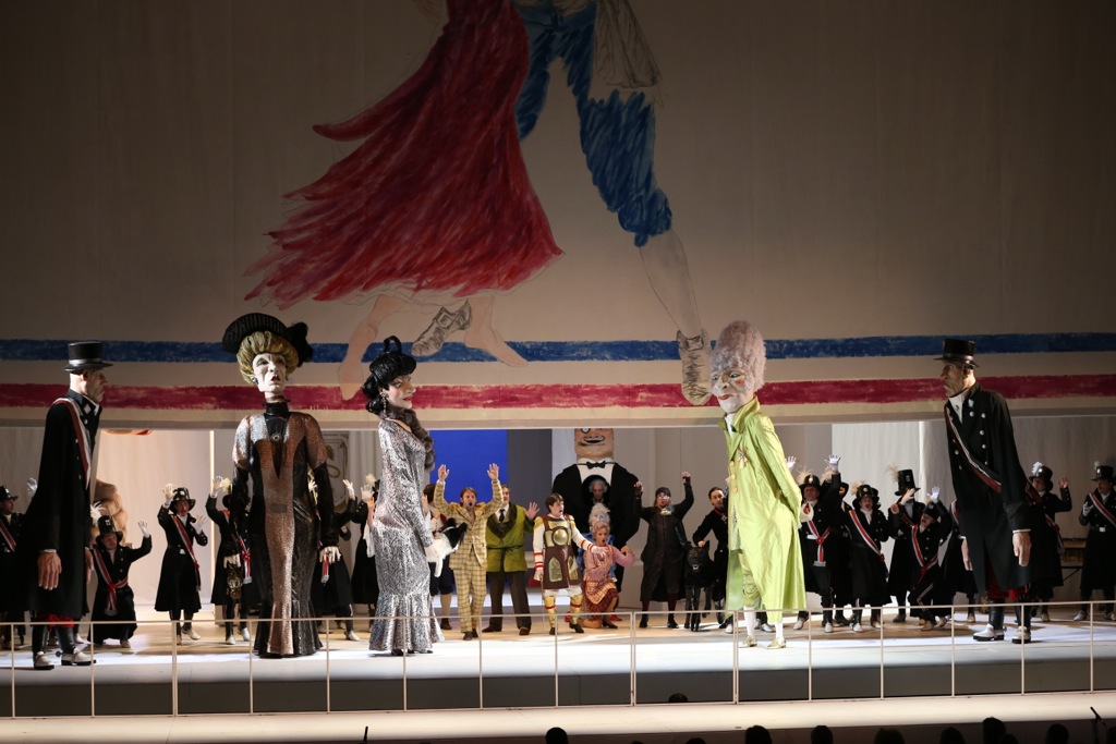 Апогеем яркой театральности, доведённой до запланированного абсурда, оказывается финал второго акта, где во время знаменитого ансамбля с хором в партер являются колоссальные куклы, забавные и великолепно выполненные дамы и господа из какого-то легчайшего материала. Ансамбль, несущий, кстати, определённый драматургический смысл, течёт себе, а всё внимание публики – на куклах. Втайне все ждут: к чему бы это? А так, просто ради шокинга. Правда, эффект тотальной театрализации, даже с привкусом гофманианы, достигается. Но уходит в ничто: лишь на поклонах кукольное роскошество скромно маячит где-то сзади.