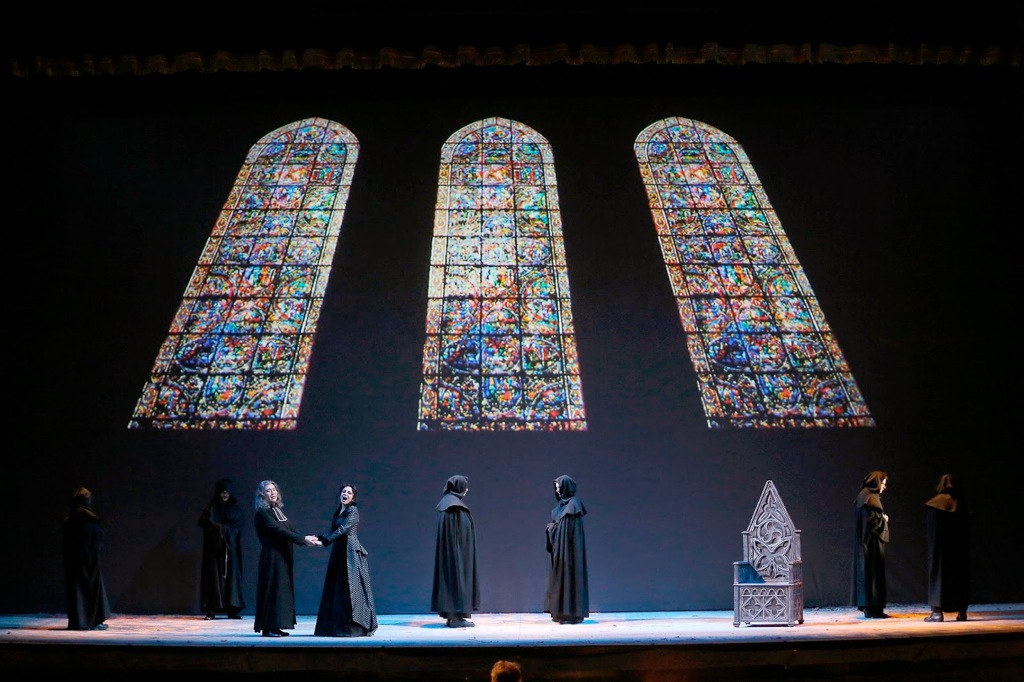 Значащийся в афише сценограф Стефано Паче почти полностью для создания внешней оправы спектакля использовал видеопроекцию: лес с пролетающими над головами верных Аштону людей птицами в первом действии, угрожающие черно-синие небеса с беспокойной и тусклой луной в первой картине второго, три больших витража в сцене подписания брачного контракта, наполовину обрушившаяся мрачная башня в качестве фона для дуэта Эдгара и Энрико. Автор видеопроекции Массимилиано имел одну фамилию с художником – Паче. У автора не хватило времени выяснить, были ли два автора сицилийской «Лючии», эмигрировавшей в Верону, родственниками... Скорее всего, были. Зато понадобились всего лишь считанные мгновения, чтобы устать от бесконечной черноты, доминировавшей в спектакле...