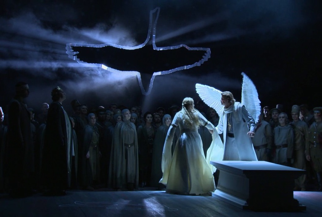 Именно поэтому она считает ниже своего достоинства оправдываться за то, что не совершала. Именно поэтому она не хочет быть униженной в рамках парадигмы Kinder — Kueche — Kirche, которую предлагает ей белокрылый посланник Грааля. И сам протест, который разрушает союз Лоэнгрина и Эльзы, — закономерен. Хоть и трагически неуместен. Брутальность Эльзы в постановке Хольтена и в исполнении Мельтон даёт фору отважности самого Лоэнгрина: перед нами настоящая Брунгильда, а не девушка, потерявшая самообладание. Но житейское трезвомыслие не вписывается в мистическую природу избавления от неизбежного. И именно этот козырь против главной героини разыгрывает Ортруда.
