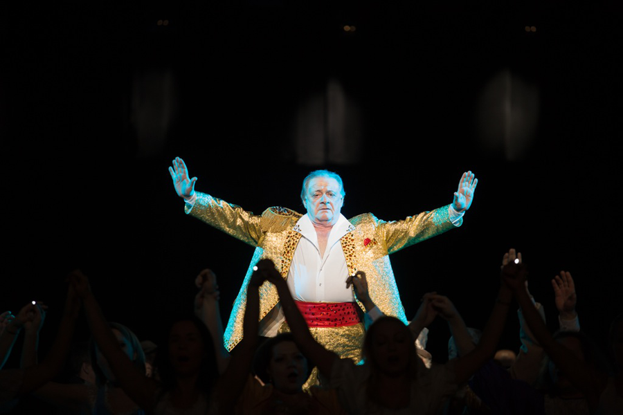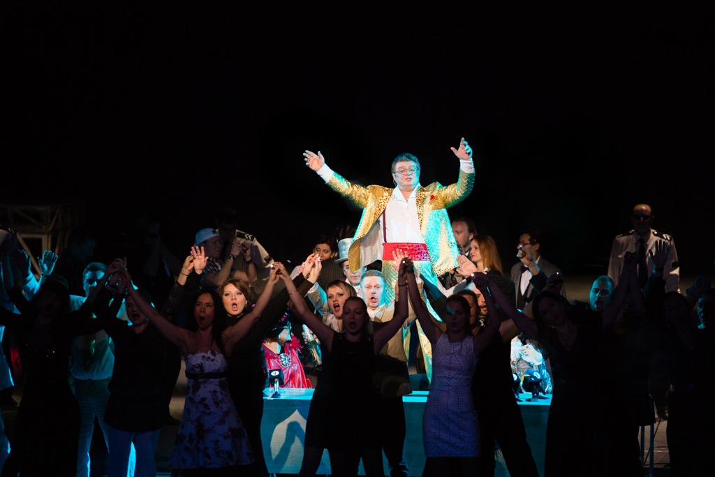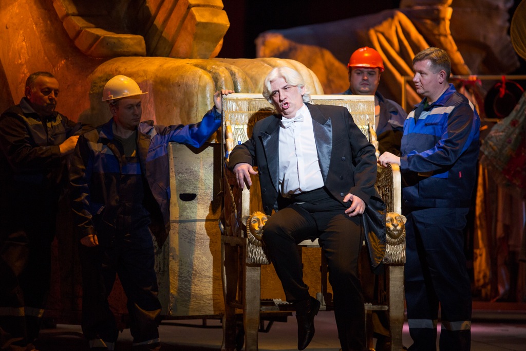 Панджавидзе сознательно идет навстречу театральным условностям, утрирует их до кричащих противоречий. Так, герои-комедианты у него выглядят очень «попсово», что подчеркивается и их костюмами, и истеричной суетой поклонников и журналистов вокруг заезжих звезд. Но сцена, на которой они должны выступить, по весьма характерным приметам – отнюдь не эстрадная, а оперно-балетная. Здесь только что закончился спектакль – по внешним признакам «Аида», – и начинается закулисная жизнь – разборка декораций, «уборка территории», репетиции, балетные классы. Примечательно, однако, что такой ход «играет», более того, неожиданно попадает в цель своей жизненностью – разве мало мы знаем примеров, когда в смутную постсоветскую эпоху роскошные залы оперных театров из-за нагрянувшей нищеты ради выживания сдавались под банкеты олигархов или концерты эстрадных звезд? И это не единственный пример того как точен режиссерский жест в этом спектакле.