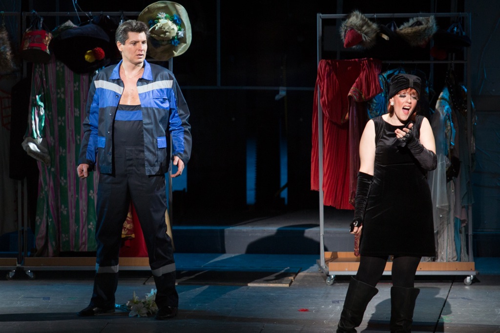 Первый состав разительно отличался от второго. Сейчас речь идет, разумеется, не о качественной оценке, а о сравнительном концептуальном подходе к ролям. Если говорить обобщенно, вынося за скобки отдельные исполнительские штрихи и индивидуальное мастерство, и понимая всю условность классификации, то первый состав выглядел театральнее, а второй – опернее. Прежде всего это касается образов Недды, Канио и в какой-то мере Сильвио. Недда у Екатерины Головлевой оказалась более по веристски натуралистичной и плотской, Нина Шарубина, лицедействуя в целом в рамках концепции режиссера, смягчала некоторые «углы» и резкости образа, памятуя, что находится все-таки не на драматической, а на оперной сцене, где важнее всего вокал! В аналогичном ключе можно сравнить выступления двух Канио – Сергея Франковского и Теймураза Гугушвили. Нервической манере первого противостояла более вальяжная и традиционная манера второго. И Сильвио – «яблоко раздора» главных героев – у Владимира Громова казался более прямолинейным и сексуально агрессивным в своем рабочем комбинезоне на голое тело, в отличие от Ильи Сильчукова, не ставшего оголяться (уж не знаю, нарушил ли он установку режиссера или такая «вольность» допускалась).