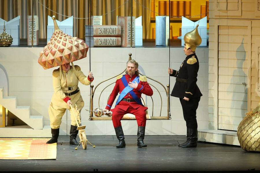 С костюмами тоже некоторый напряг. Режиссёр, она же художник Анна Матисон рассудила: коли опера написана во времена Николая II как политическая сатира, все мужчины должны быть в военной форме той эпохи. А чтобы смешно – головные уборы солистов в виде церковных куполов. Чем важнее персона, тем купол больше. На этом, собственно, юмор, помимо текста, и заканчивается. А купола продолжают мешать певцам двигаться и петь, налезают на глаза и прочее. Но бог с ним, с неудобством, если бы аксессуары активно работали!