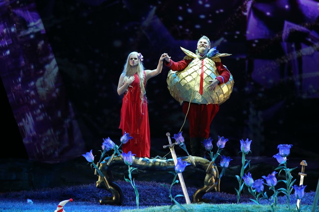 Когда стена раскроется, зрителям тоже некоторое время будет чем заняться – разглядывать нагорожённое на сцене. Тут тебе и карусели, и купола на двухъярусной конструкции, и ширмы с множеством окон, и странная скамейка-качели, которая в воздух с исполнителями так и не поднимется (возможно, по техническим причинам), хотя петушку самый бы раз бить тревогу с высоты.