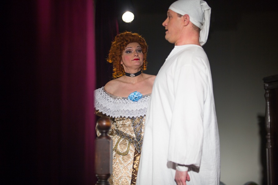 Не будем детально излагать типичную фарсовую историю того, как служанке Серпине (Елена Синявская) удалось ловкостью и хитростью женить на себе старого холостяка Уберто (Дмитрий Капилов). Михаилом Панджавидзе было принято разумное решение – все речитативы исполнять на русском языке (Панджавидзе сам и перевел текст), сохранив итальянский язык для арий и дуэтов. Лицедейство трех участников представления, включая слугу Веспоне (Олег Гордынец, роль без слов) отличалось живостью, а ограниченное сценическое пространство благодаря ставшей главным «действующим лицом» кровати стесняло меньше, чем можно было предполагать, исходя технических условий зала. Режиссерская «отсебятина» – «немой» Веспоне превратился в забавного комментатора или, можно сказать, «конферансье» этого вечера – выглядела уместной, а реплики слуги остроумными.